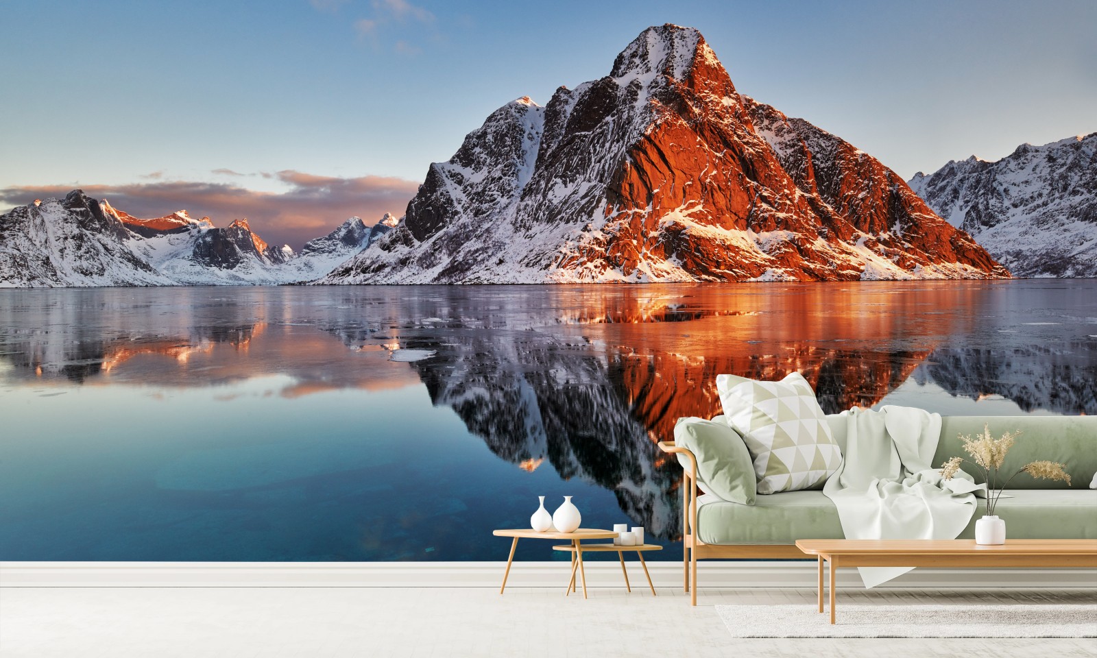 Atemberaubender Sonnenaufgang über den Bergen der Lofoten, der sich in ruhigem Fjordwasser spiegelt und nordische Gelassenheit sowie warmes Licht in Ihren Raum bringt.MehrWeniger