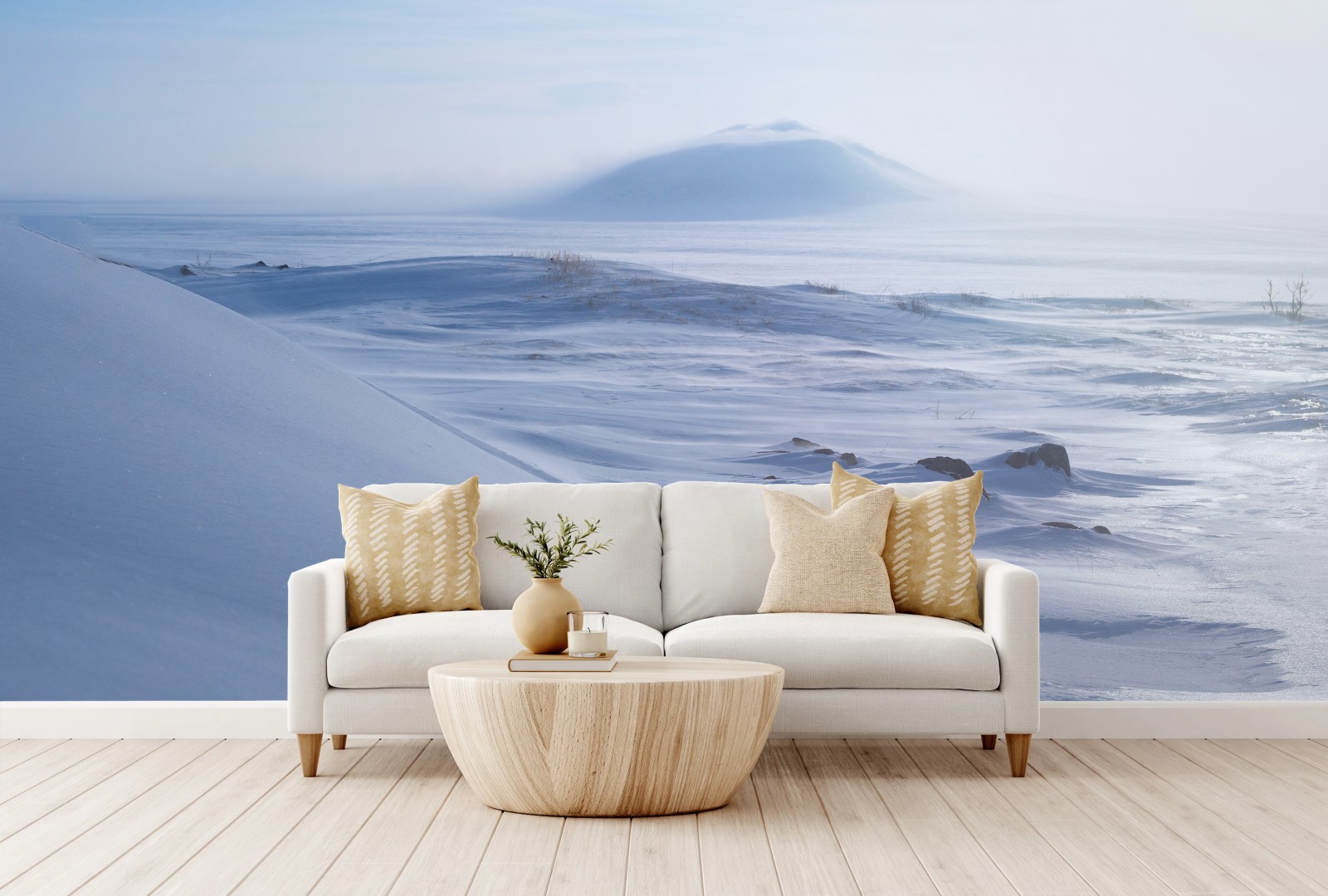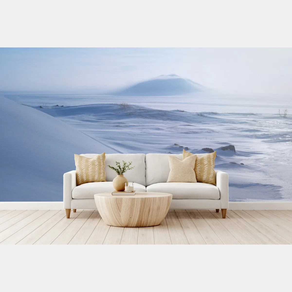 Erleben Sie die stille Schönheit einer schneebedeckten Tundra in Tschukotka im sanften blauen Licht, ideal für ruhige Wohnräume.MehrWeniger