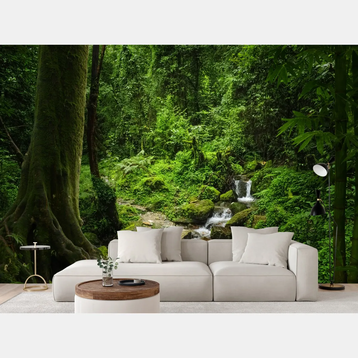 Bringen Sie mit einer üppigen grünen Waldwasserfall-Szene beruhigende Naturstimmung in Ihr Zuhause.