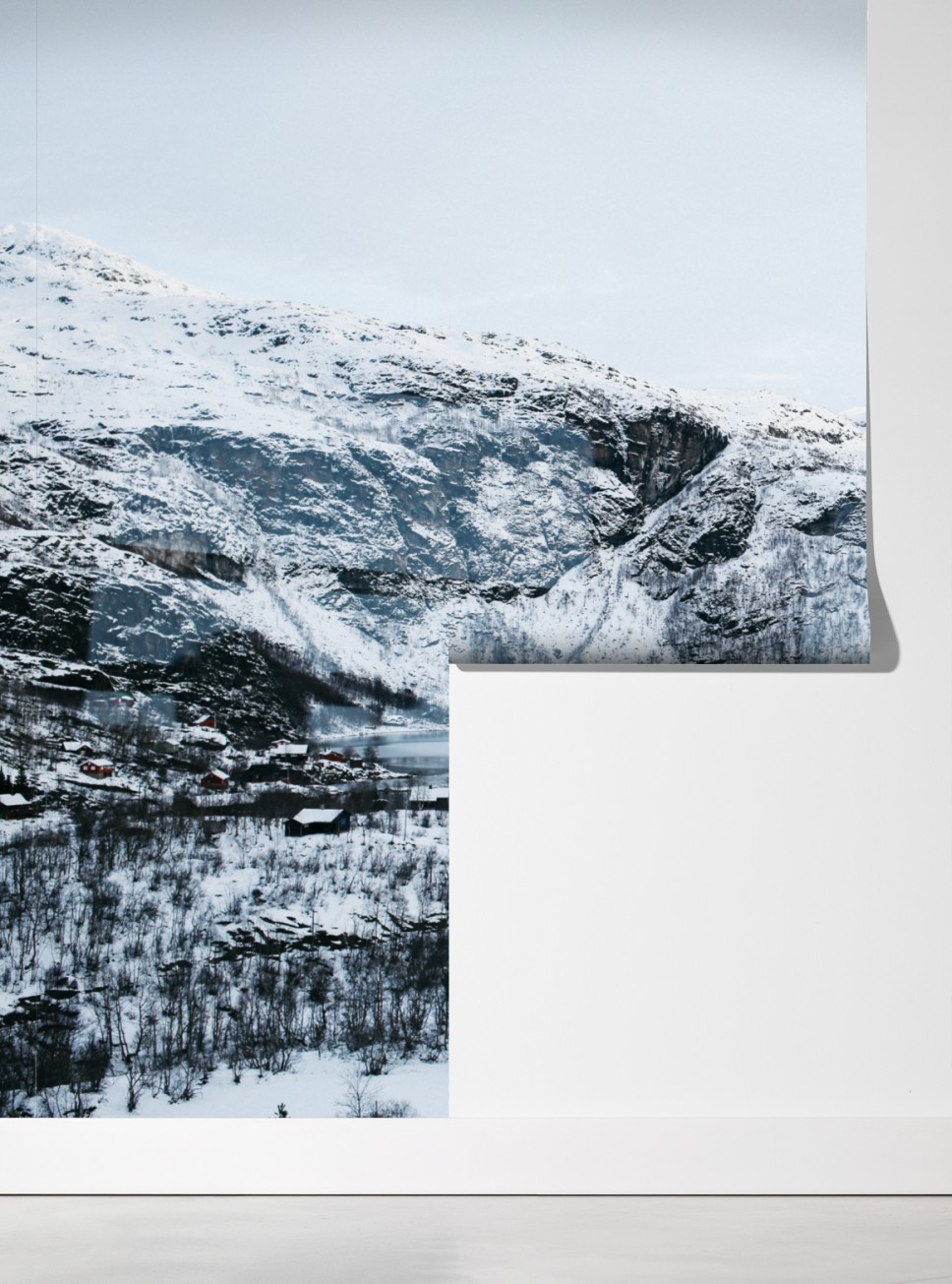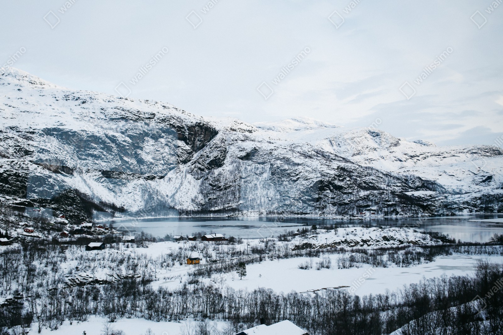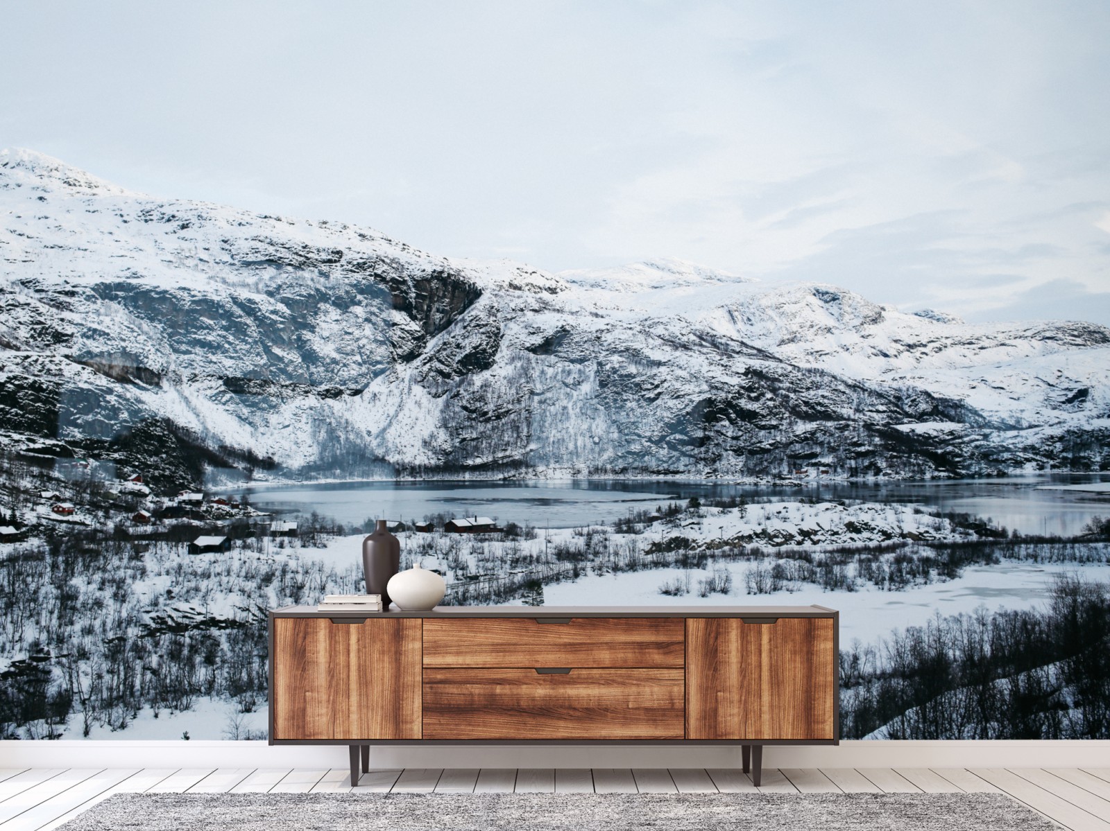 Bringen Sie nordische Ruhe in Ihr Zuhause mit dieser ruhigen Winterlandschaft mit schneebedeckten Gipfeln und einem stillen, zugefrorenen See.
