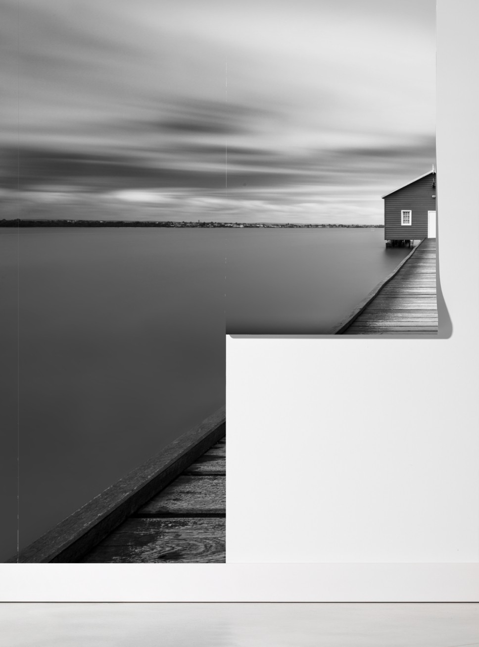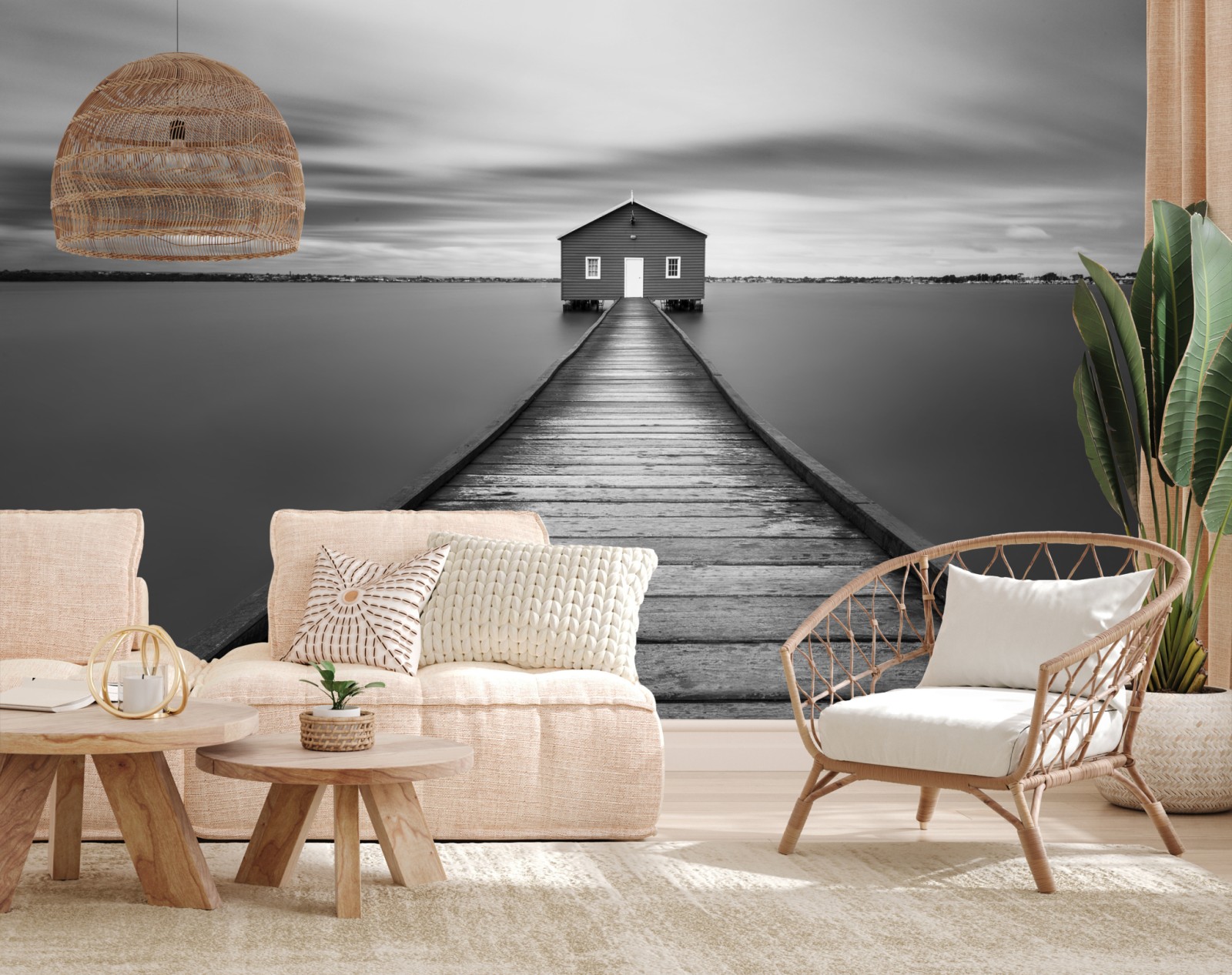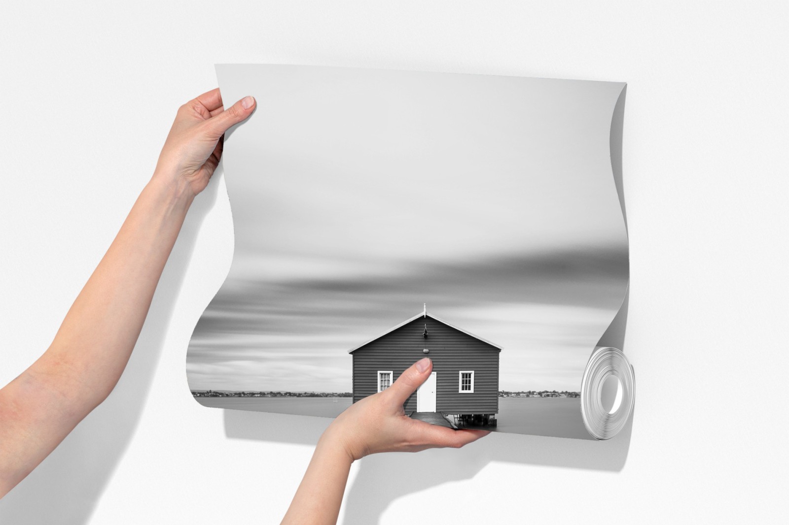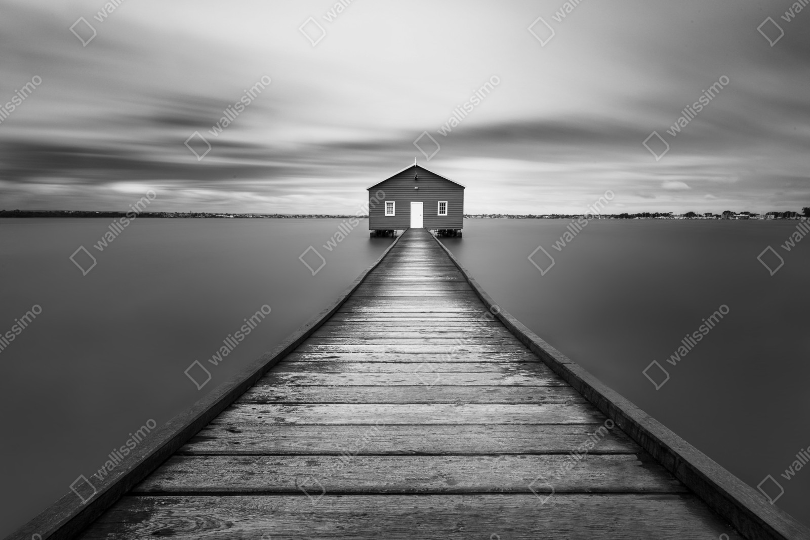 Bringen Sie ruhige Minimalistik in Ihr Zuhause mit diesem schwarz-weißen Langzeitbelichtungsbild eines einsamen Bootshauses und Stegs, ideal als dezenter Blickfang.