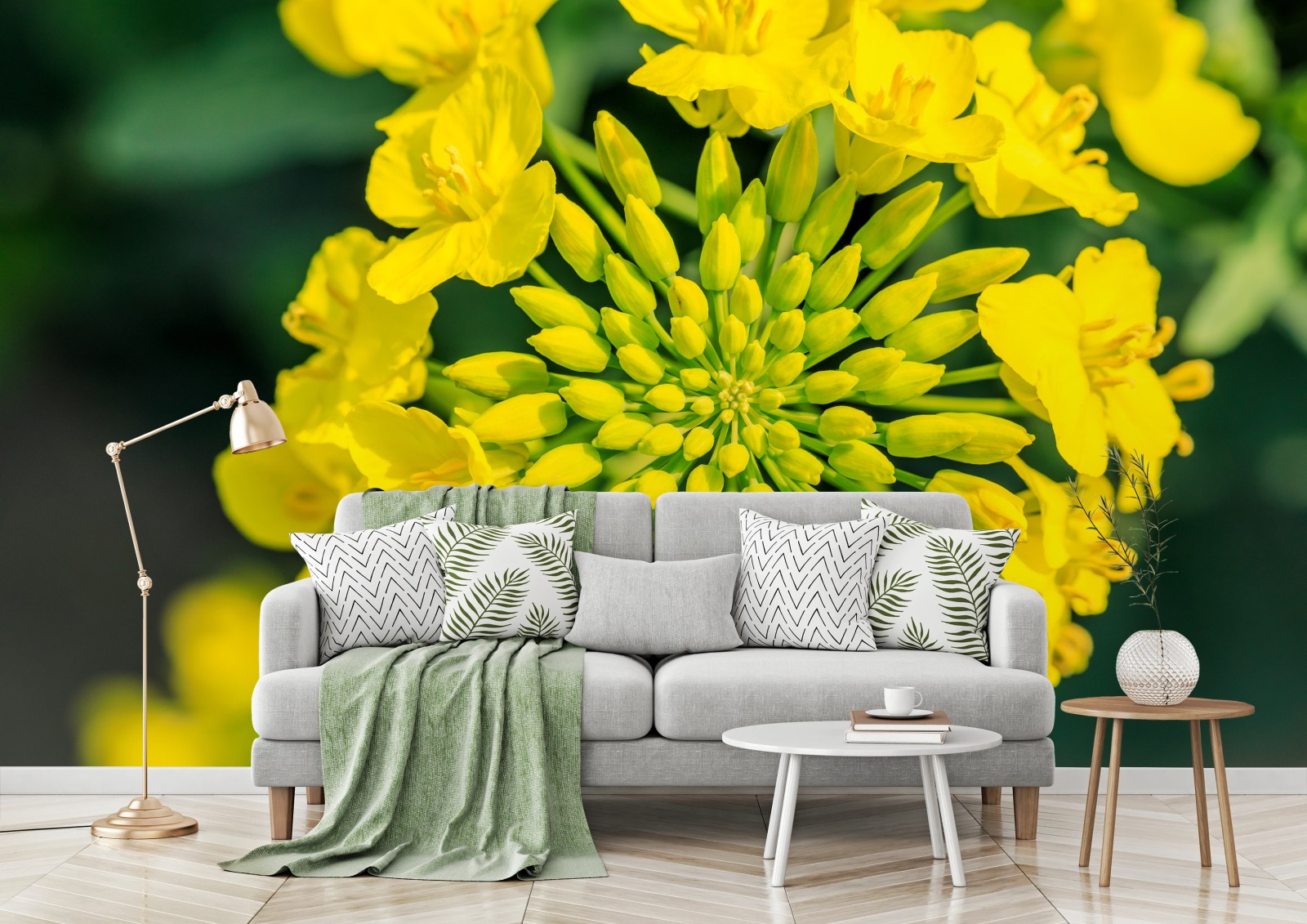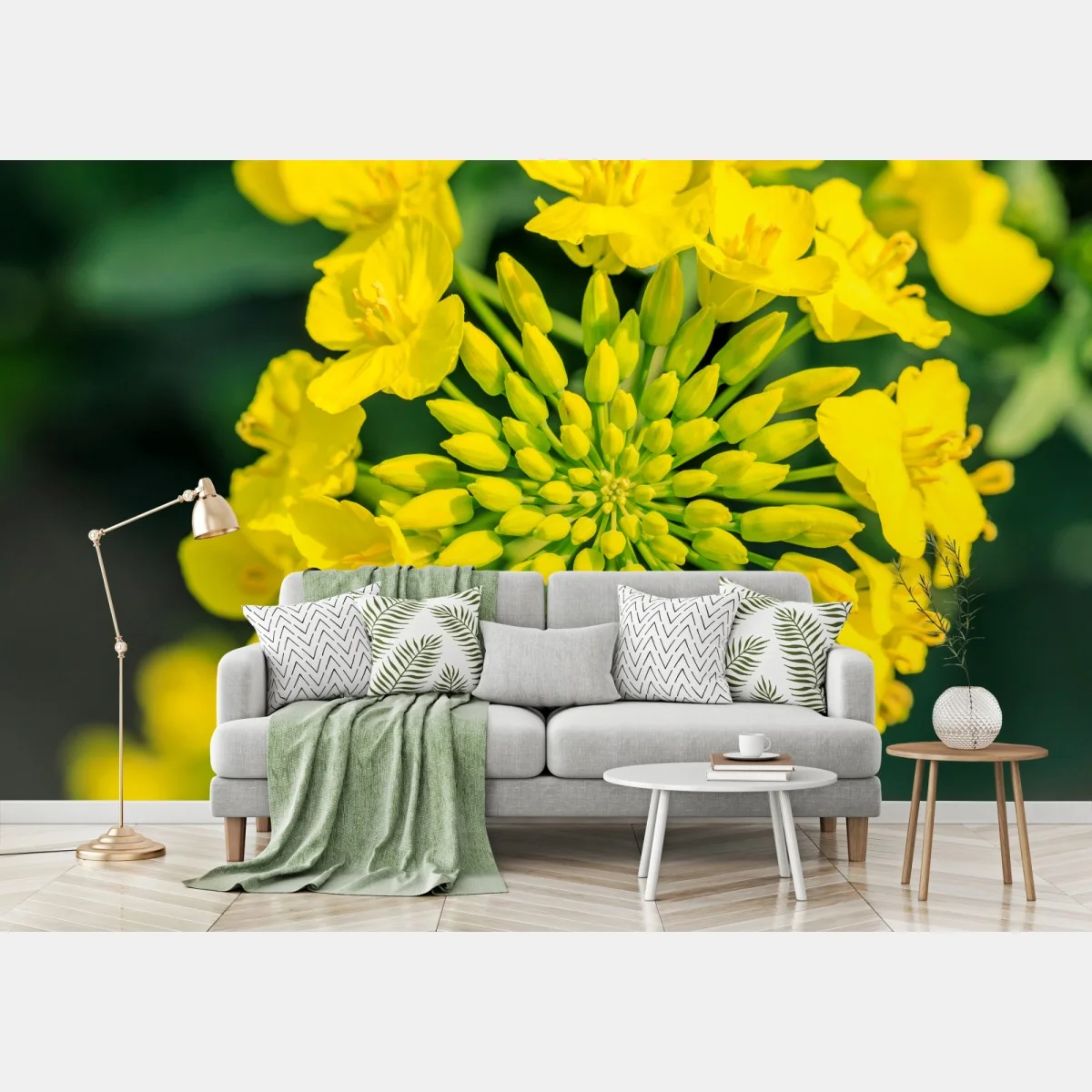 Fototapete Lebhafte gelbe rapsblüte im nahen makro