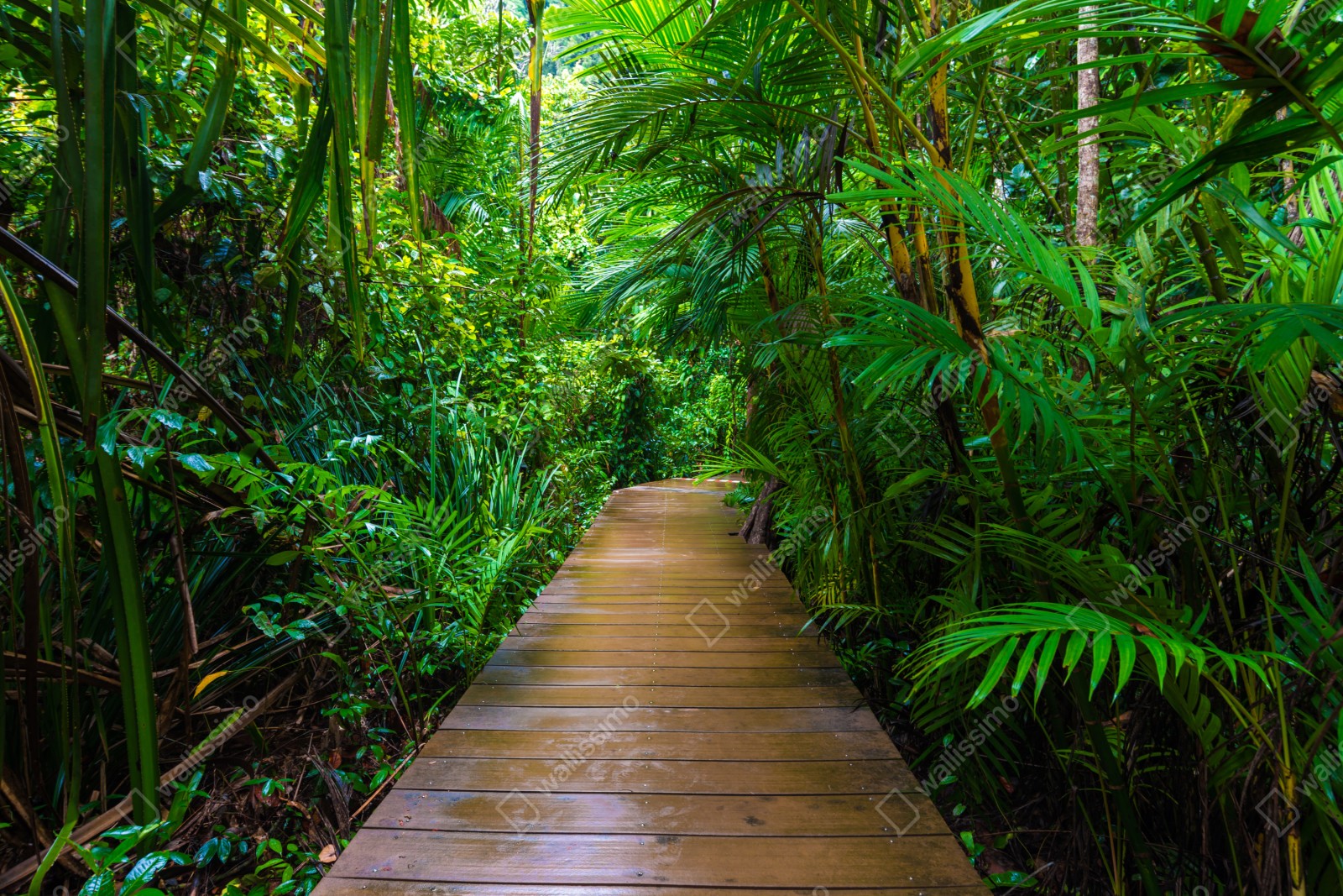 Fototapete mangrovensteg durch üppigen grünen dschungel