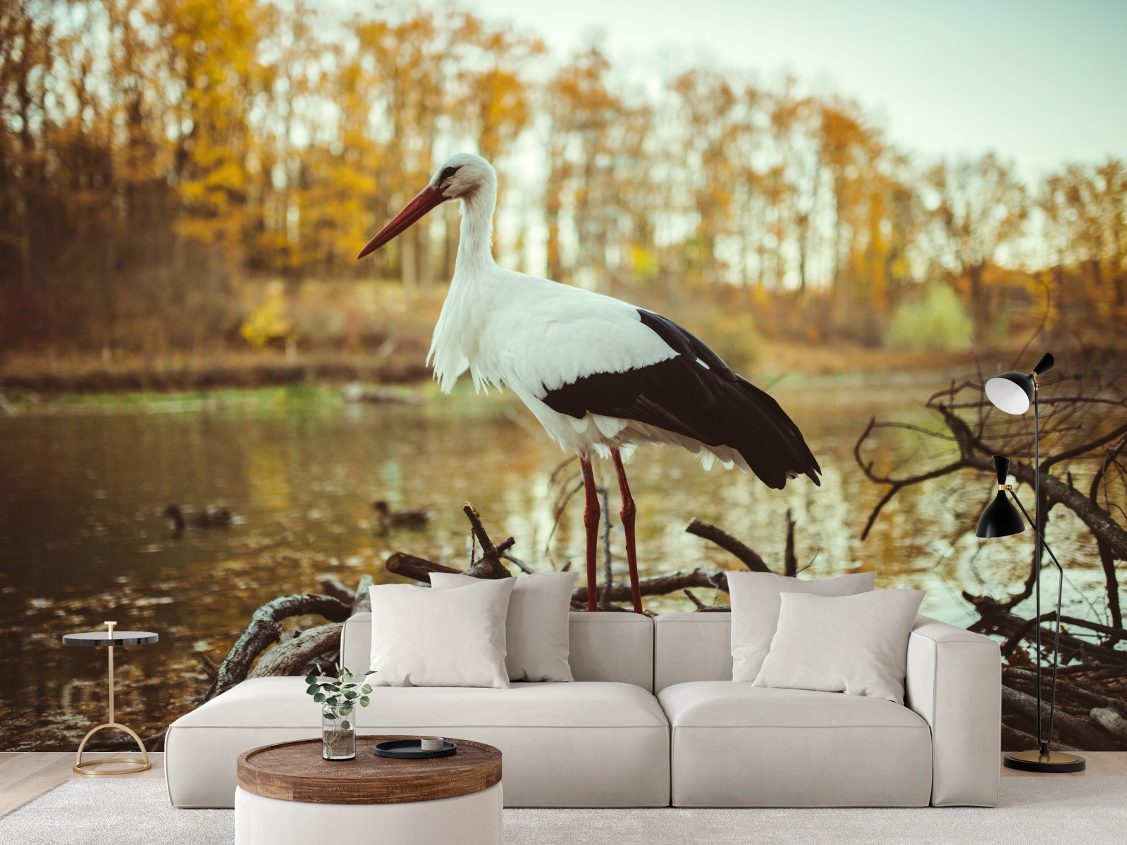 Fototapete Weißer storch am herbstlichen see