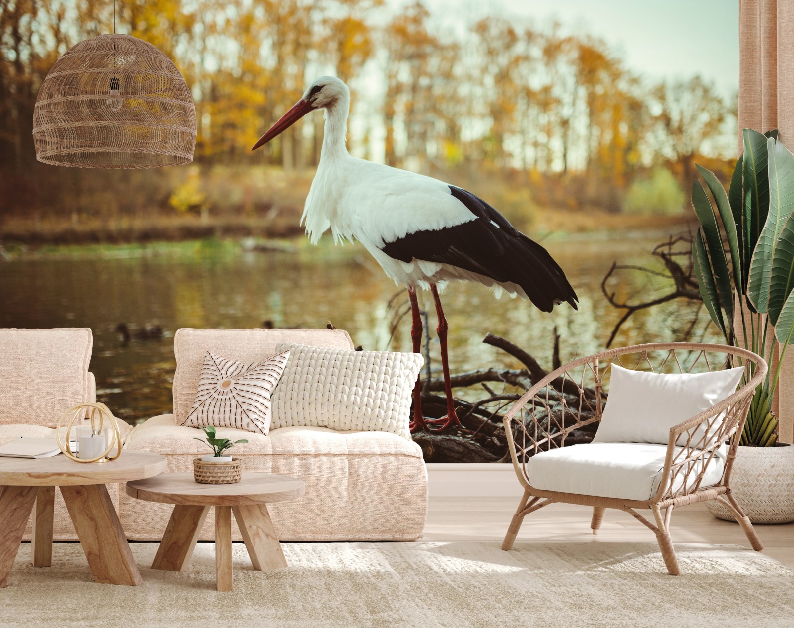 Fototapete Weißer storch am herbstlichen see