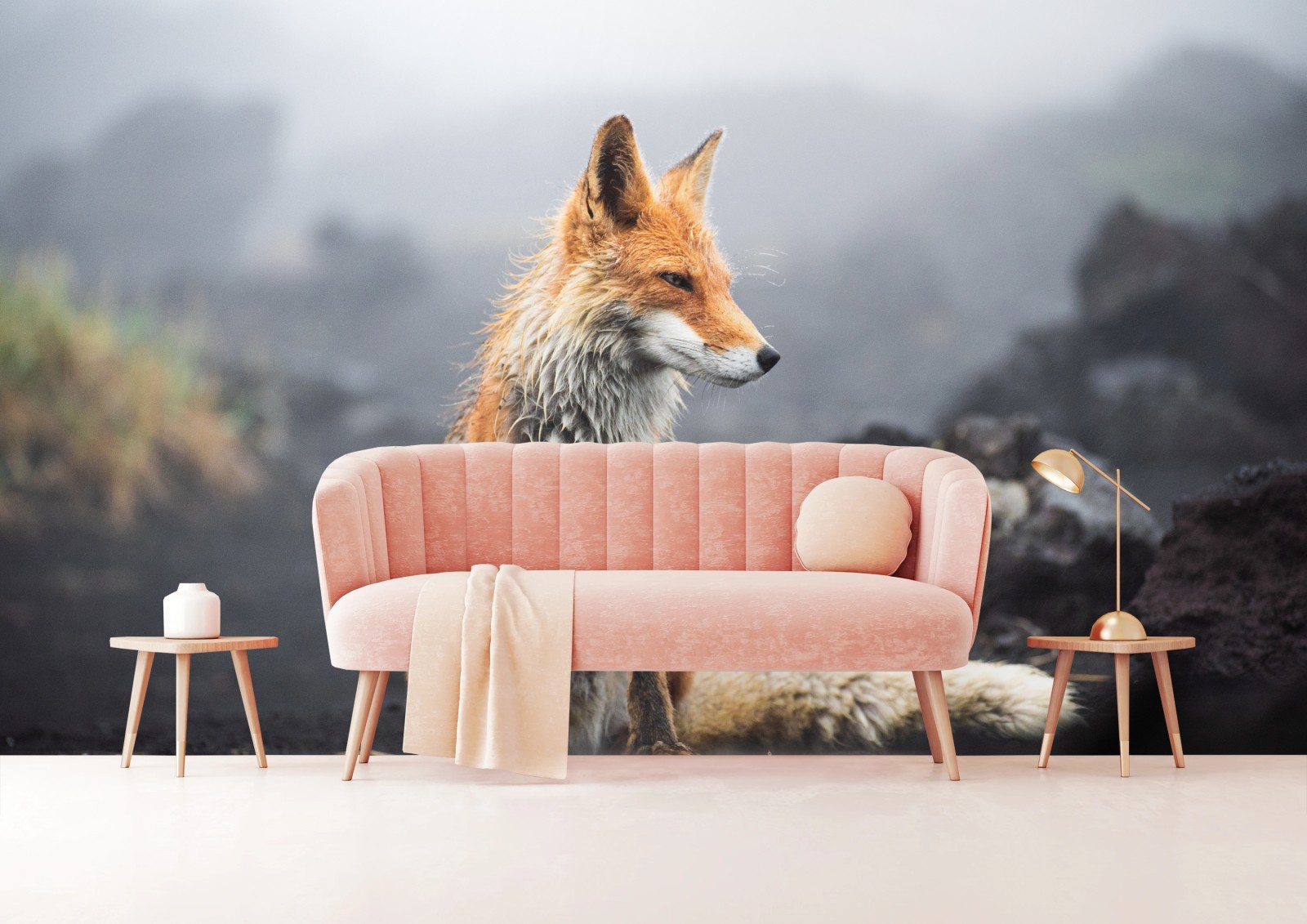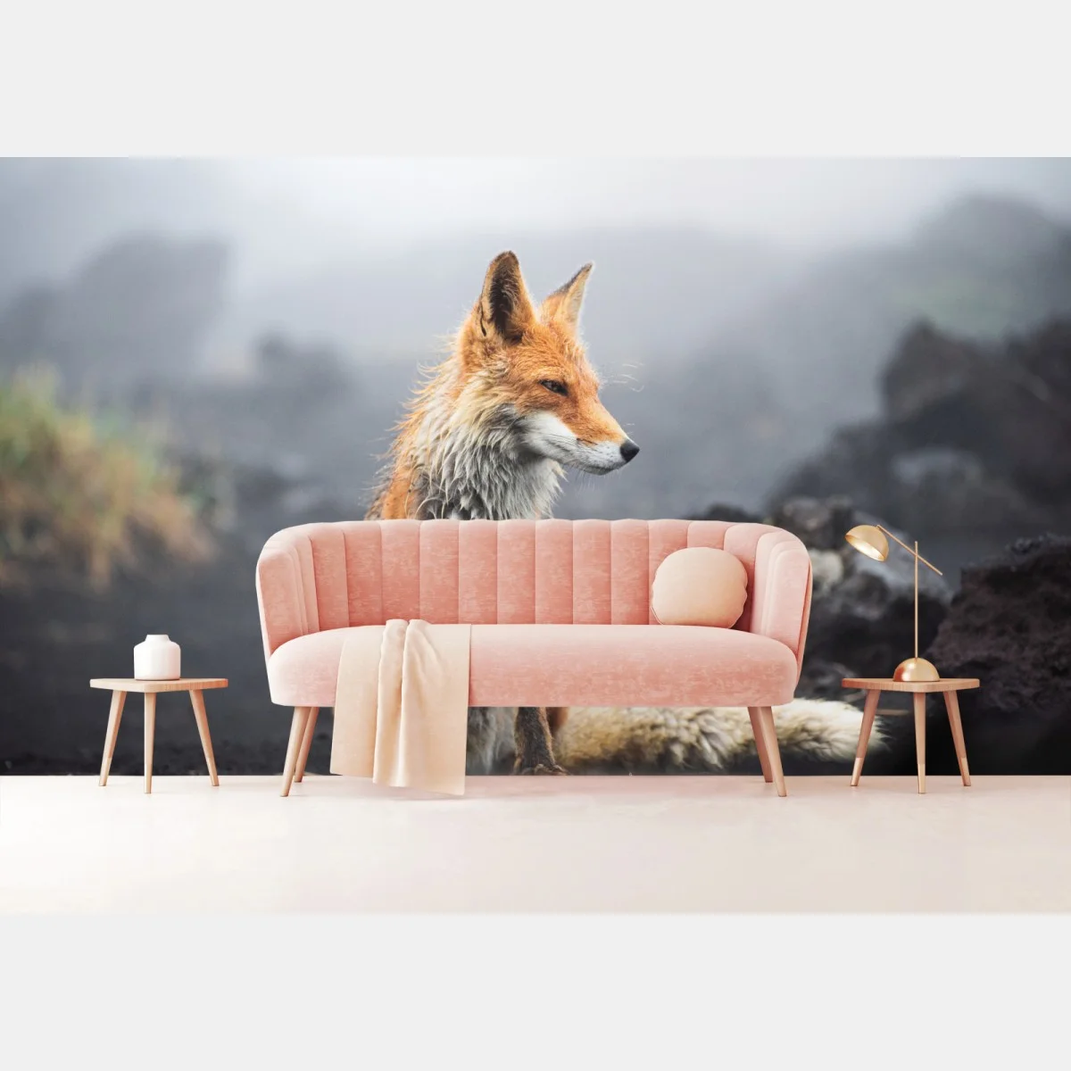 Fototapete Roter fuchs in nebliger landschaft
