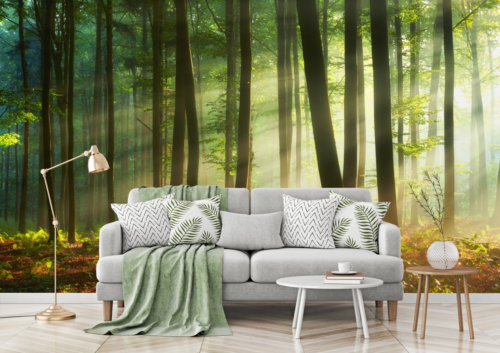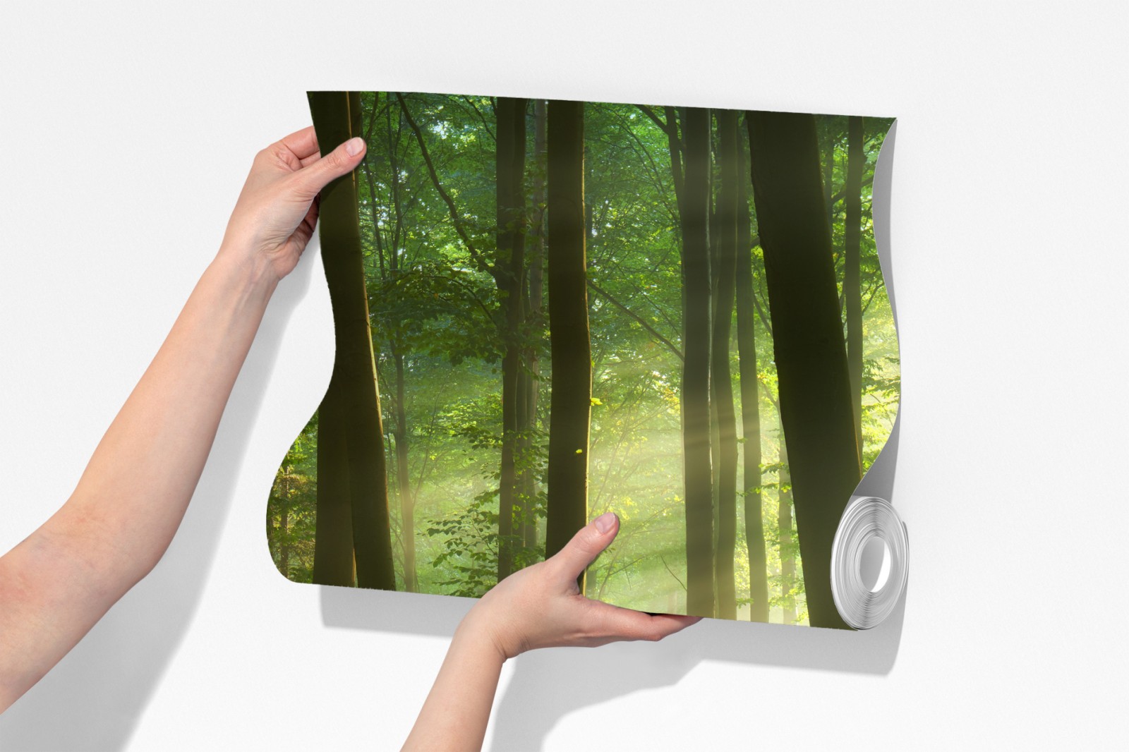Bringen Sie die Ruhe eines sonnenbeschienenen Waldes in Ihr Zuhause mit dieser friedlichen morgendlichen Waldszene, perfekt zum Schaffen einer natürlichen, entspannenden Atmosphäre.