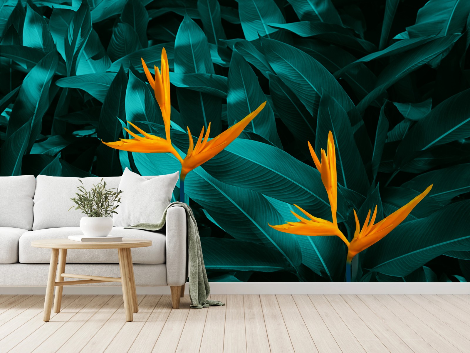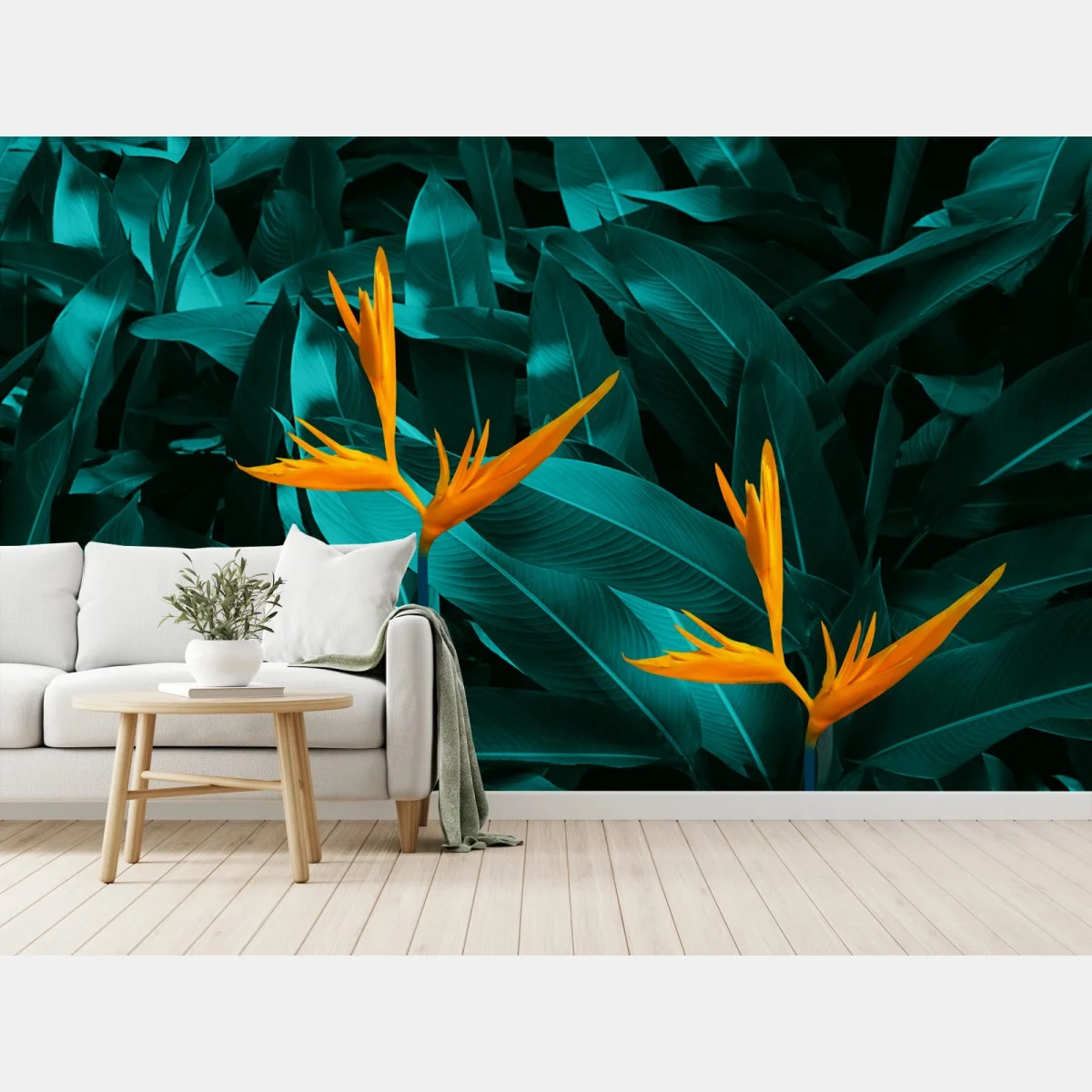 Fototapete Tropische strelitzie auf türkisfarbenen blättern
