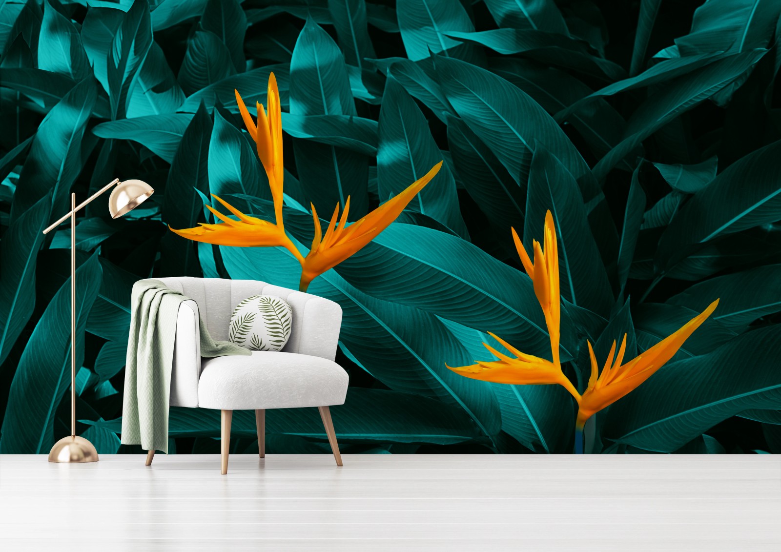 Fototapete Tropische strelitzie auf türkisfarbenen blättern