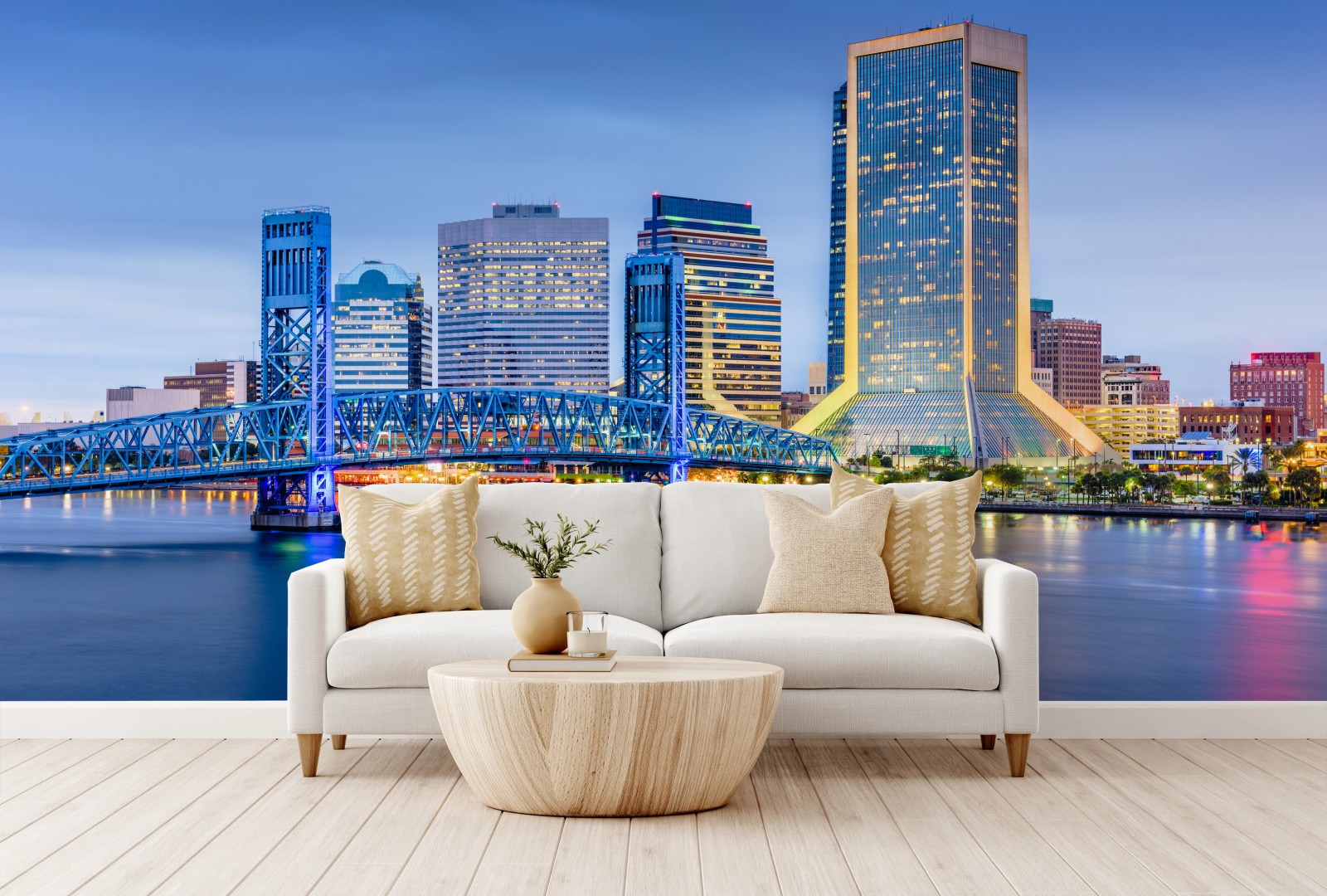 Erleben Sie die ruhige Schönheit der Innenstadt von Jacksonville in der blauen Stunde, ideal um urbanen Charme in Ihr Zuhause zu bringen.MehrWeniger