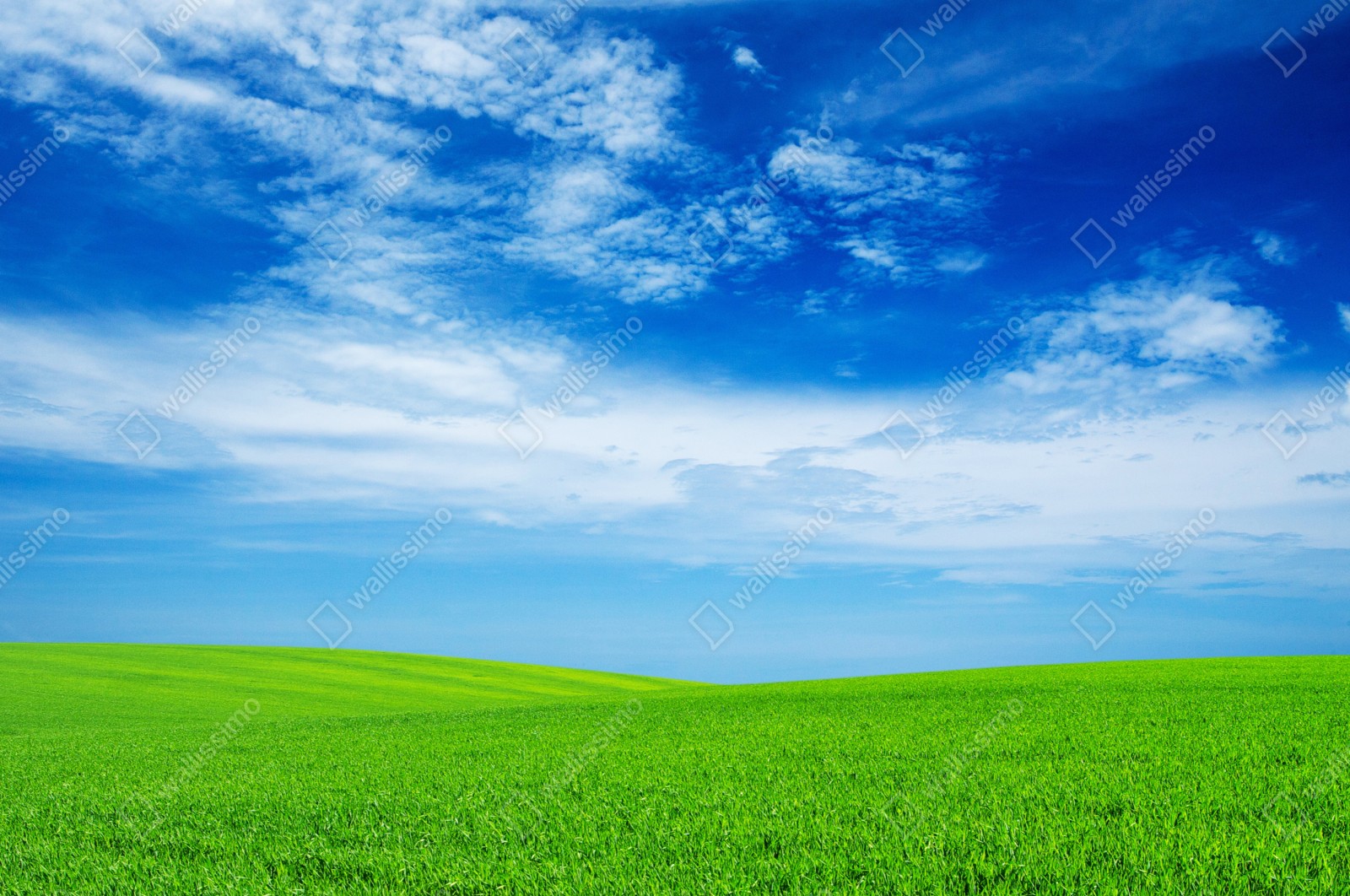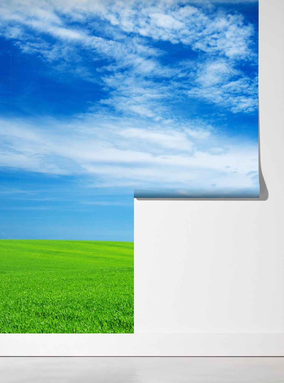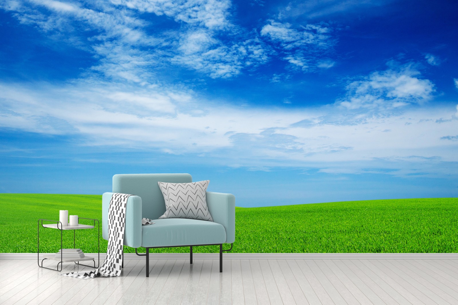 Bringen Sie beruhigende Natur ins Zuhause mit einer lebendigen grünen Wiese unter klarem blauem Himmel.