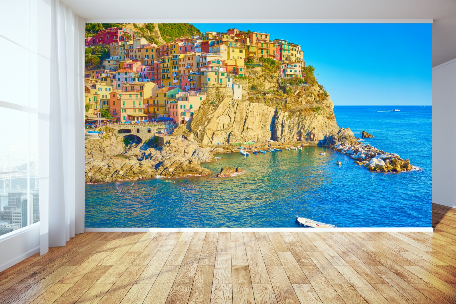 Lebhafte mediterrane Küstenlandschaft mit pastellfarbenen Häusern auf Klippen und kristallklarem blauem Meer, die jedem Raum sonnigen Urlaubscharme verleiht.