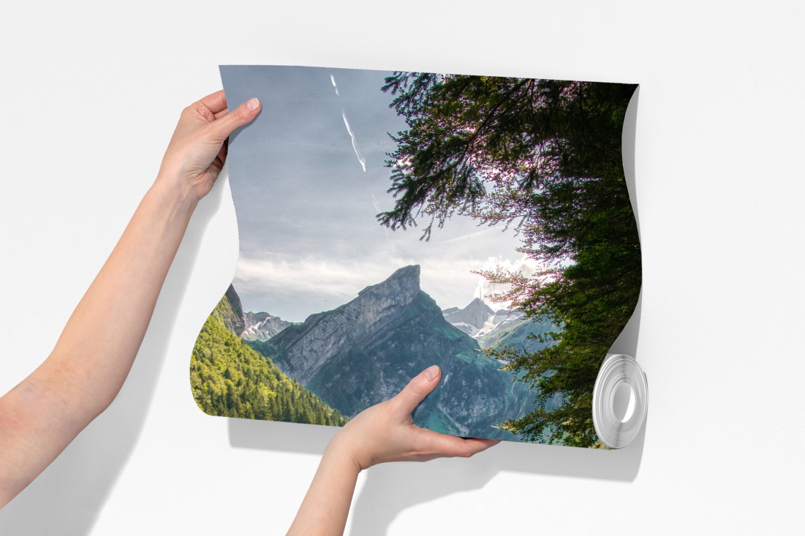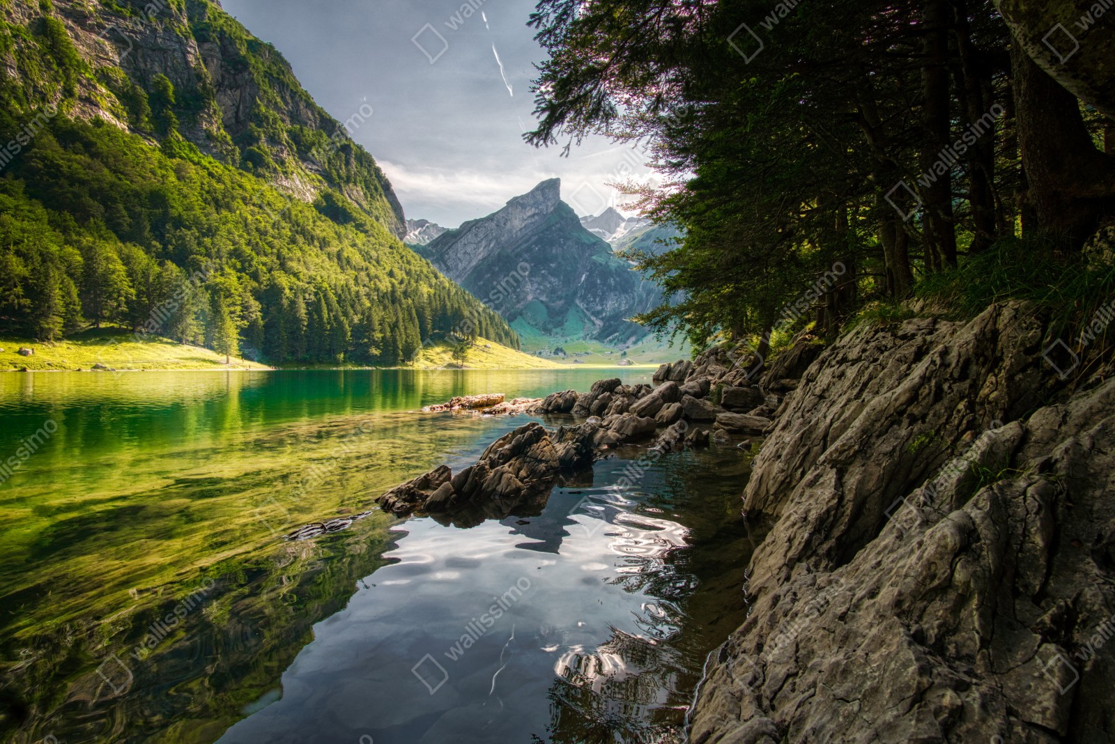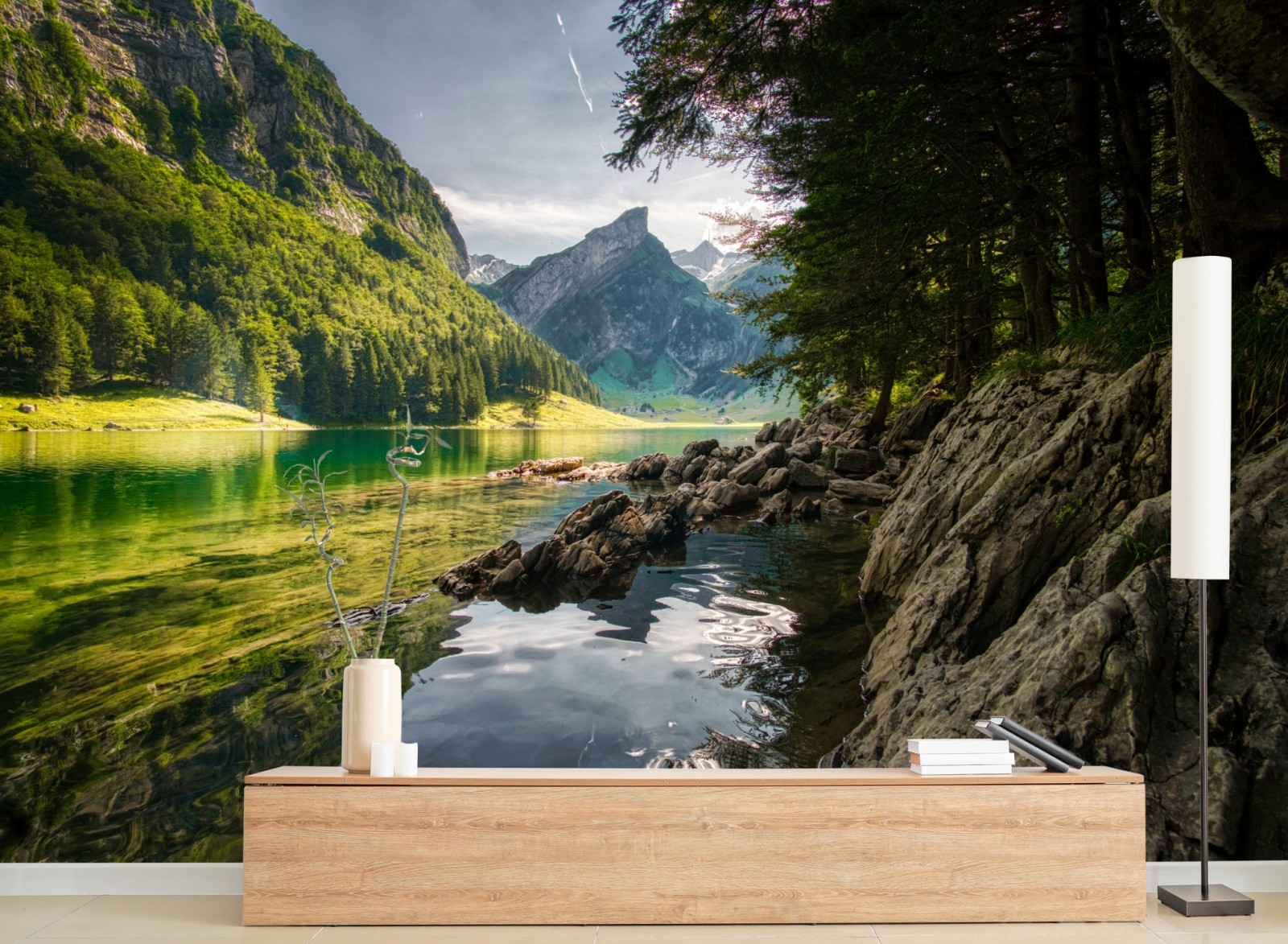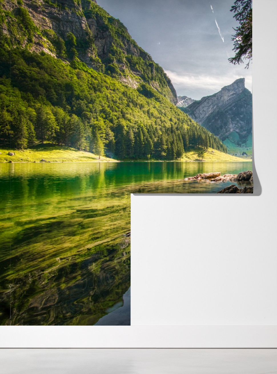 Fototapete ruhiger bergsee mit spiegelungen im wald – Wallnifity®