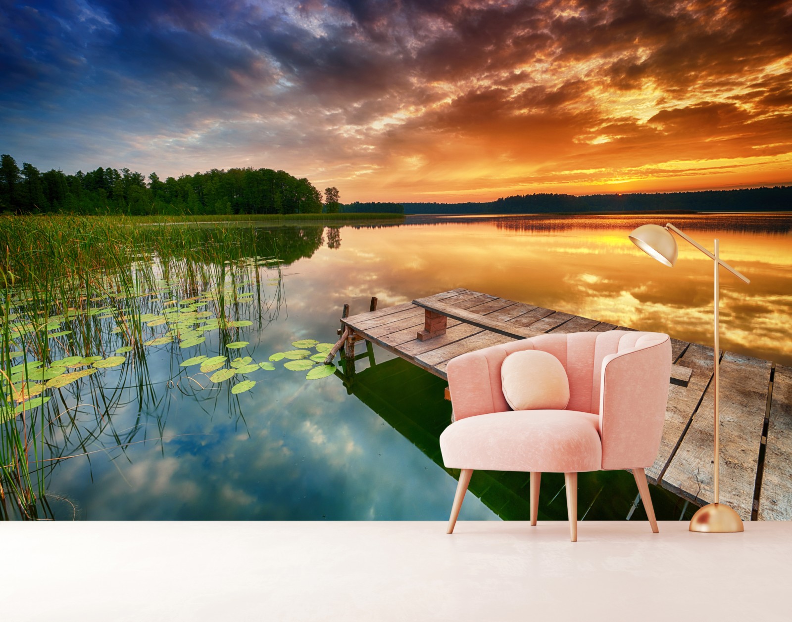 Bringen Sie morgendliche Ruhe ins Zuhause mit einem goldenen Sonnenaufgang über einem ruhigen See, ideal um jedem Raum Wärme und Gelassenheit zu verleihen.