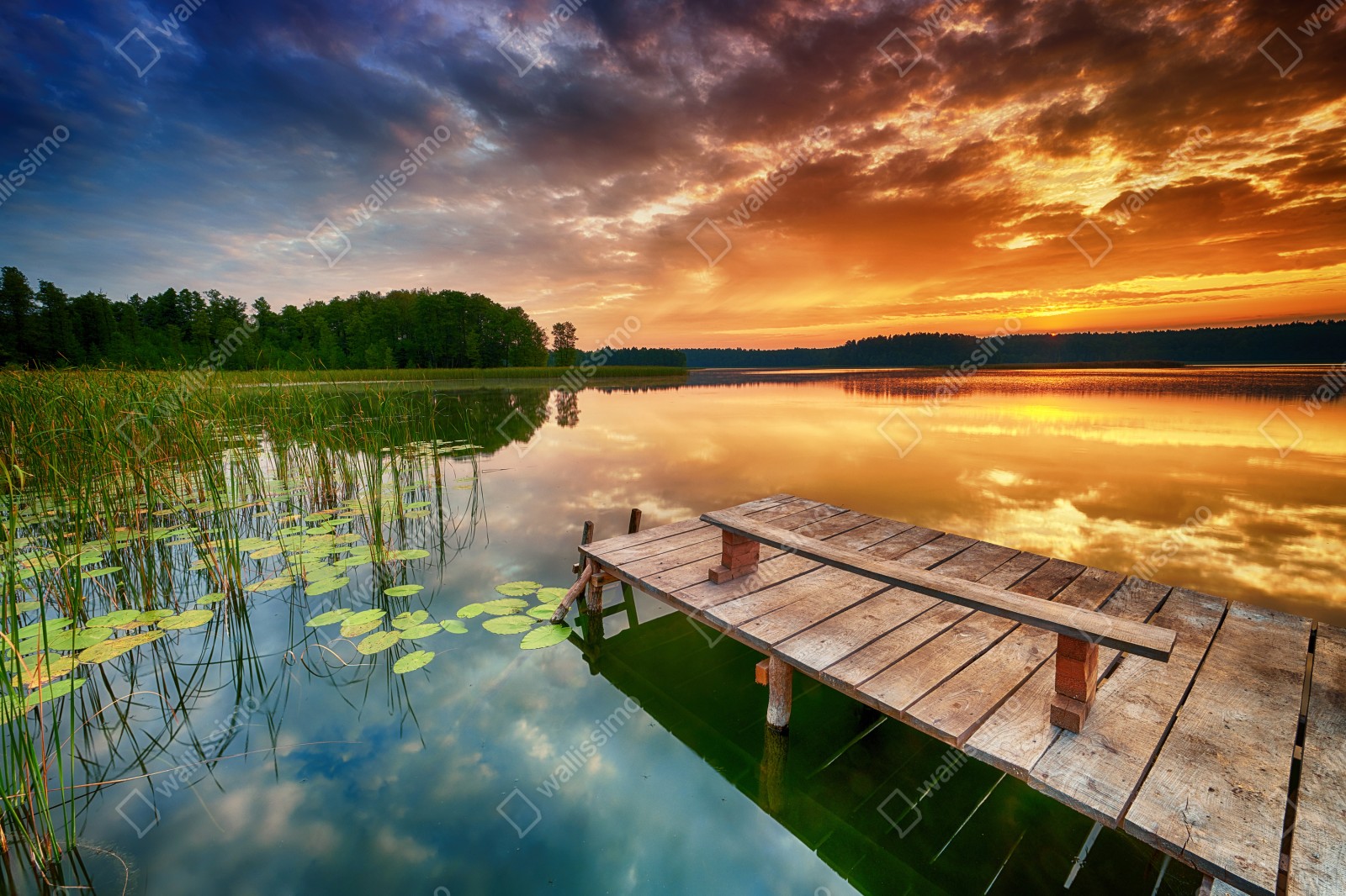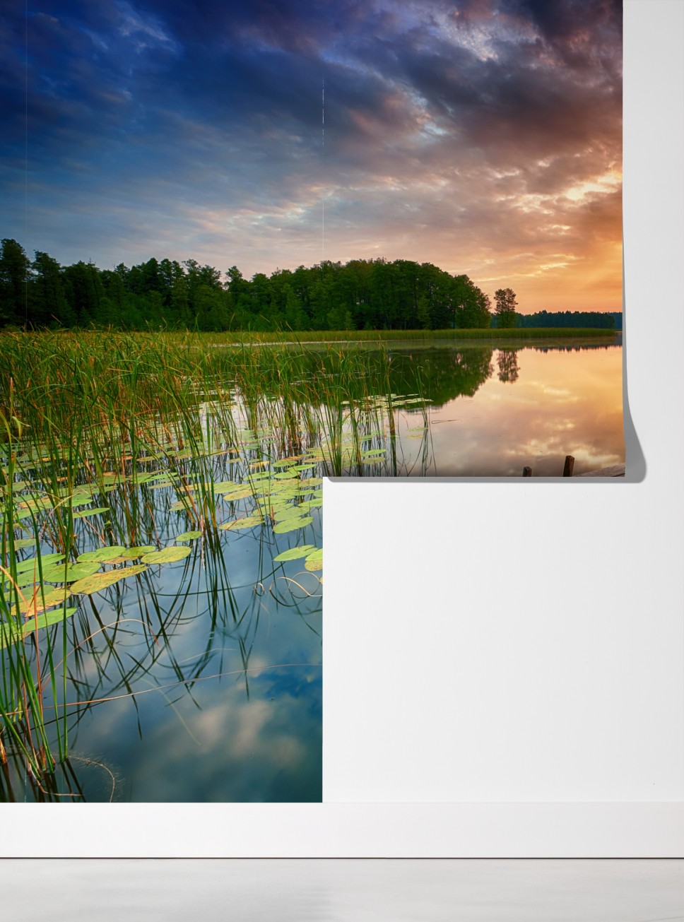 Fototapete goldener sonnenaufgang über ruhigem see