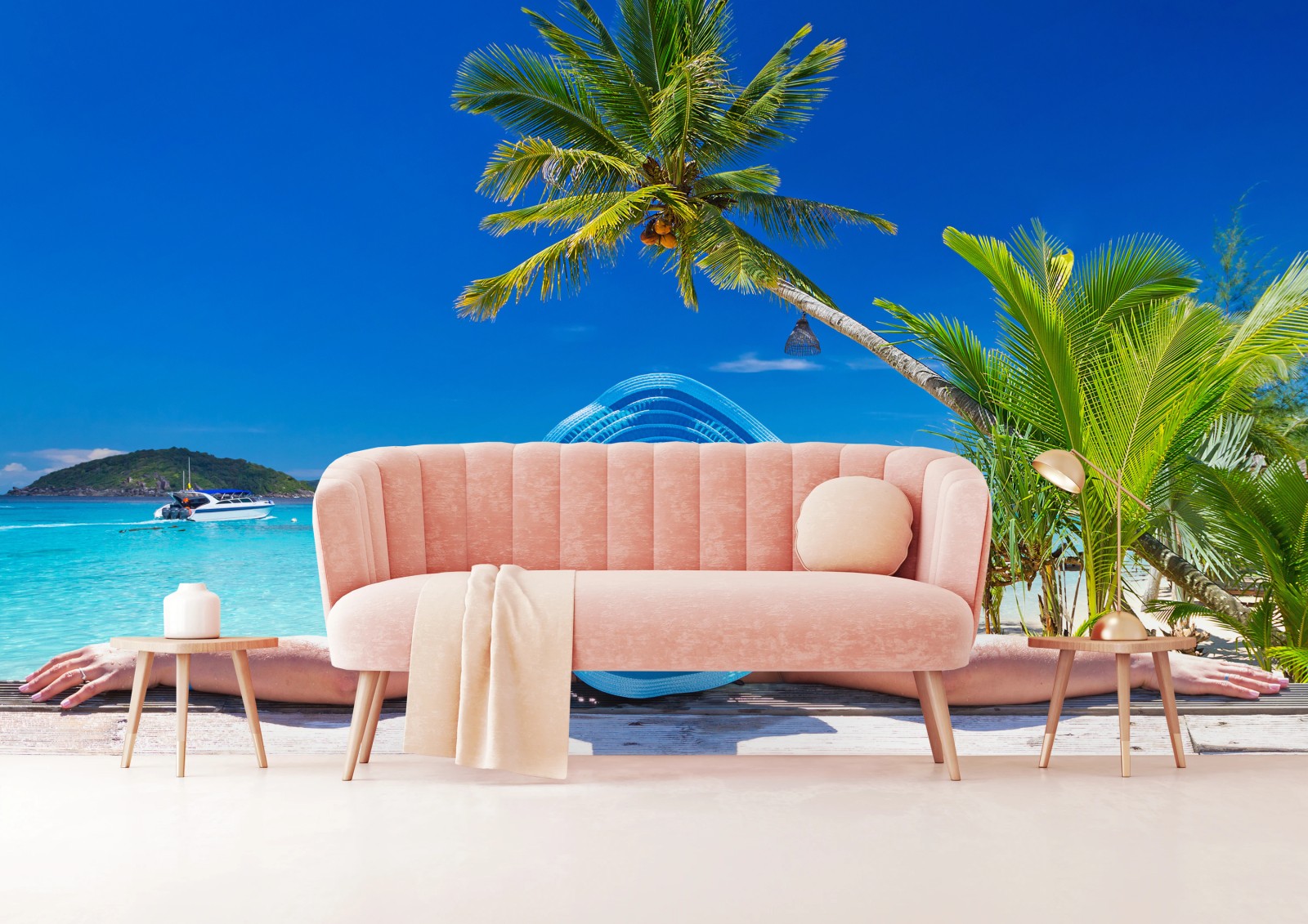 Fototapete Tropischer strand mit blauem sonnenhut
