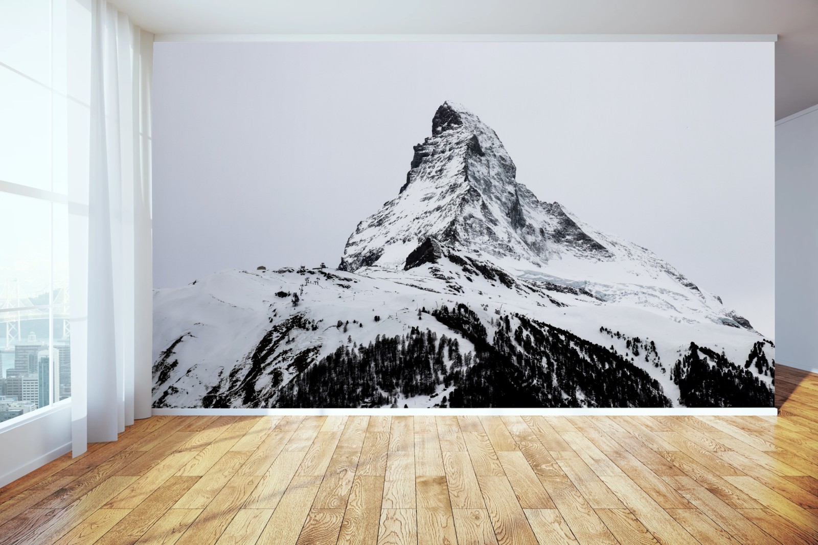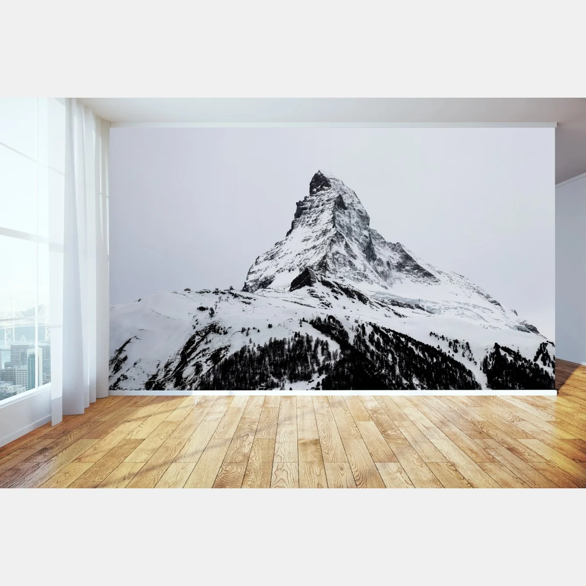 Ein eindrucksvolles monochromes Foto eines schneebedeckten Gipfels, das Ruhe und elegante Dramatik an jede Wand bringt.MehrWeniger
