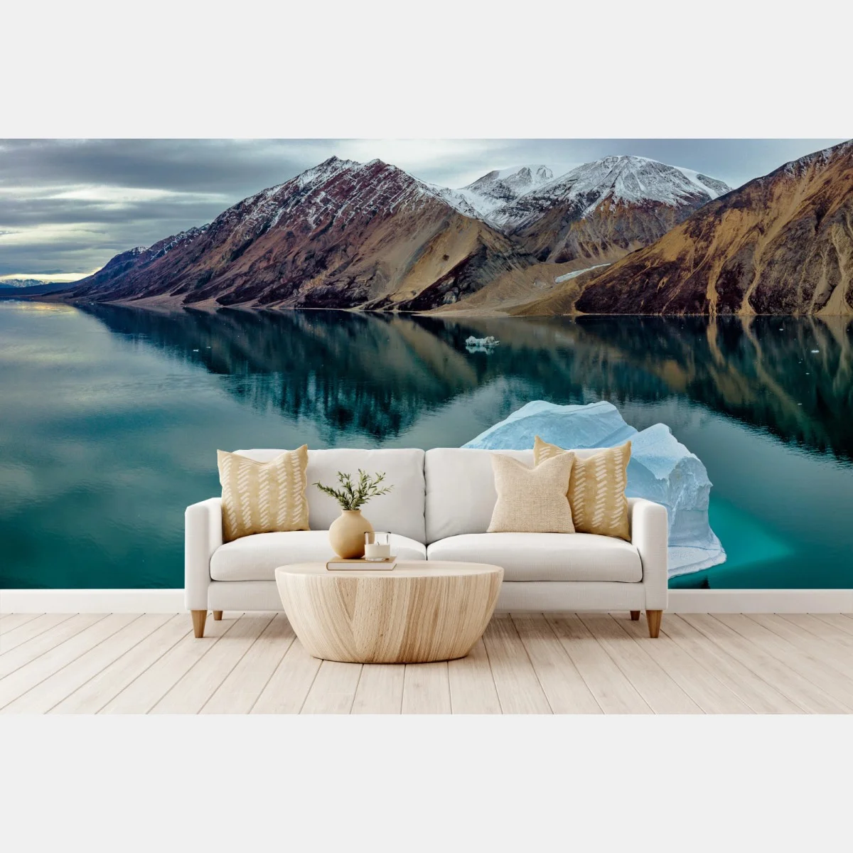 Bringen Sie ruhige arktische Schönheit in Ihren Raum mit leuchtendem türkisfarbenem Wasser, einer geformten Eisscholle und dramatischen Bergreflexionen.MehrWeniger