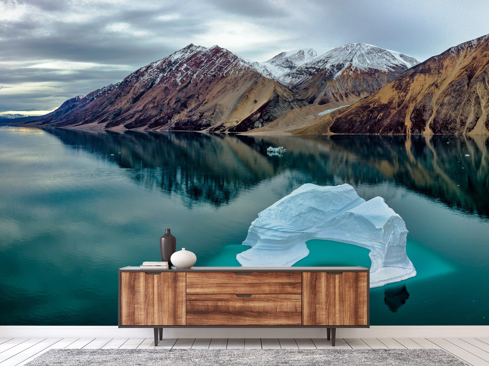Fototapete Eisberg und bergreflexionen in türkisfarbenem wasser