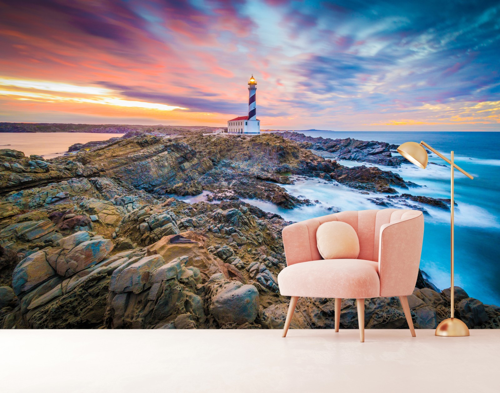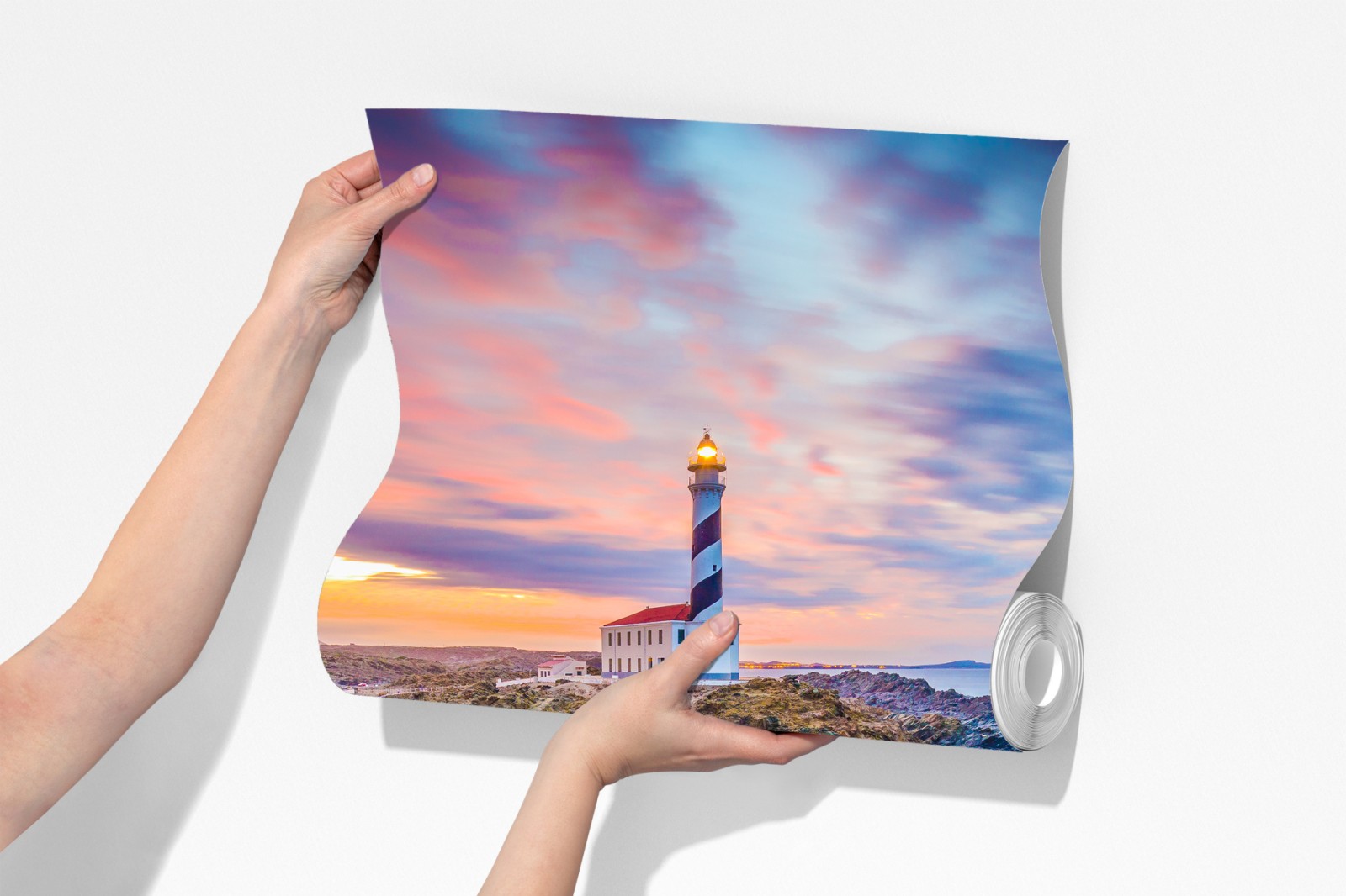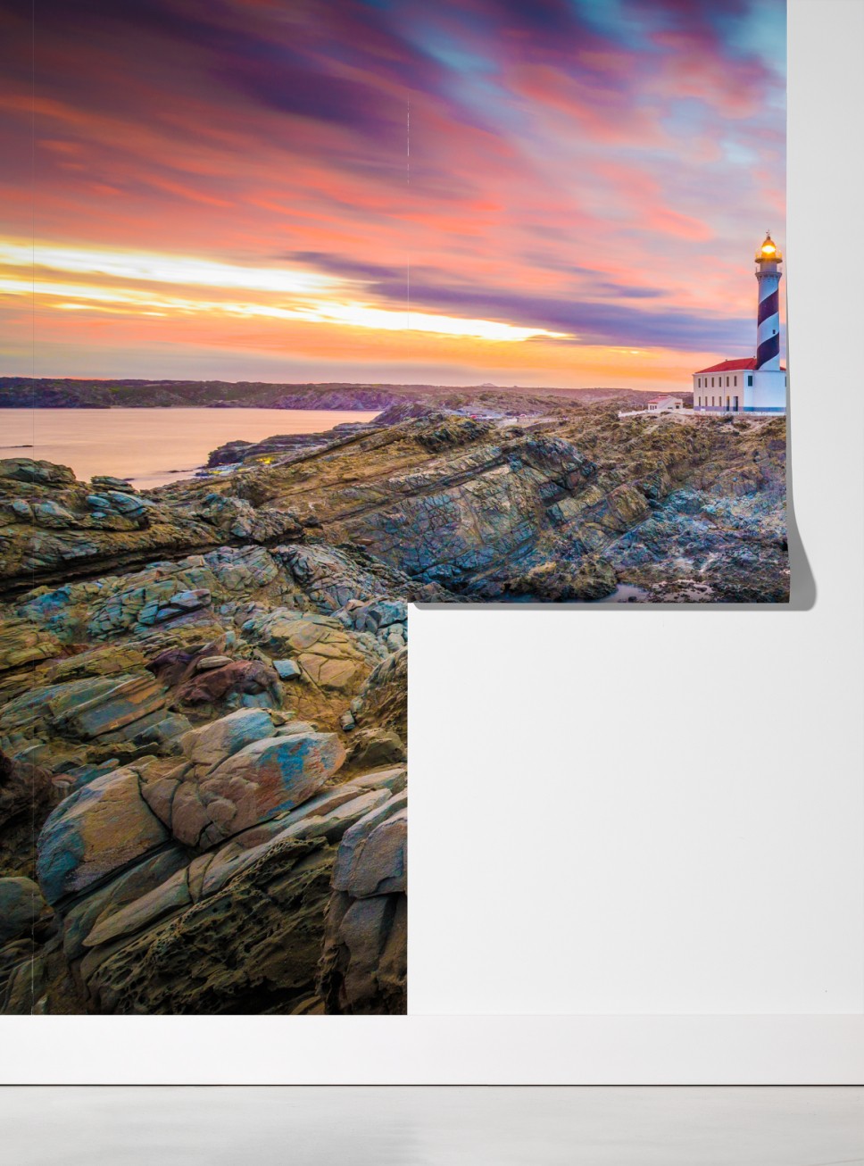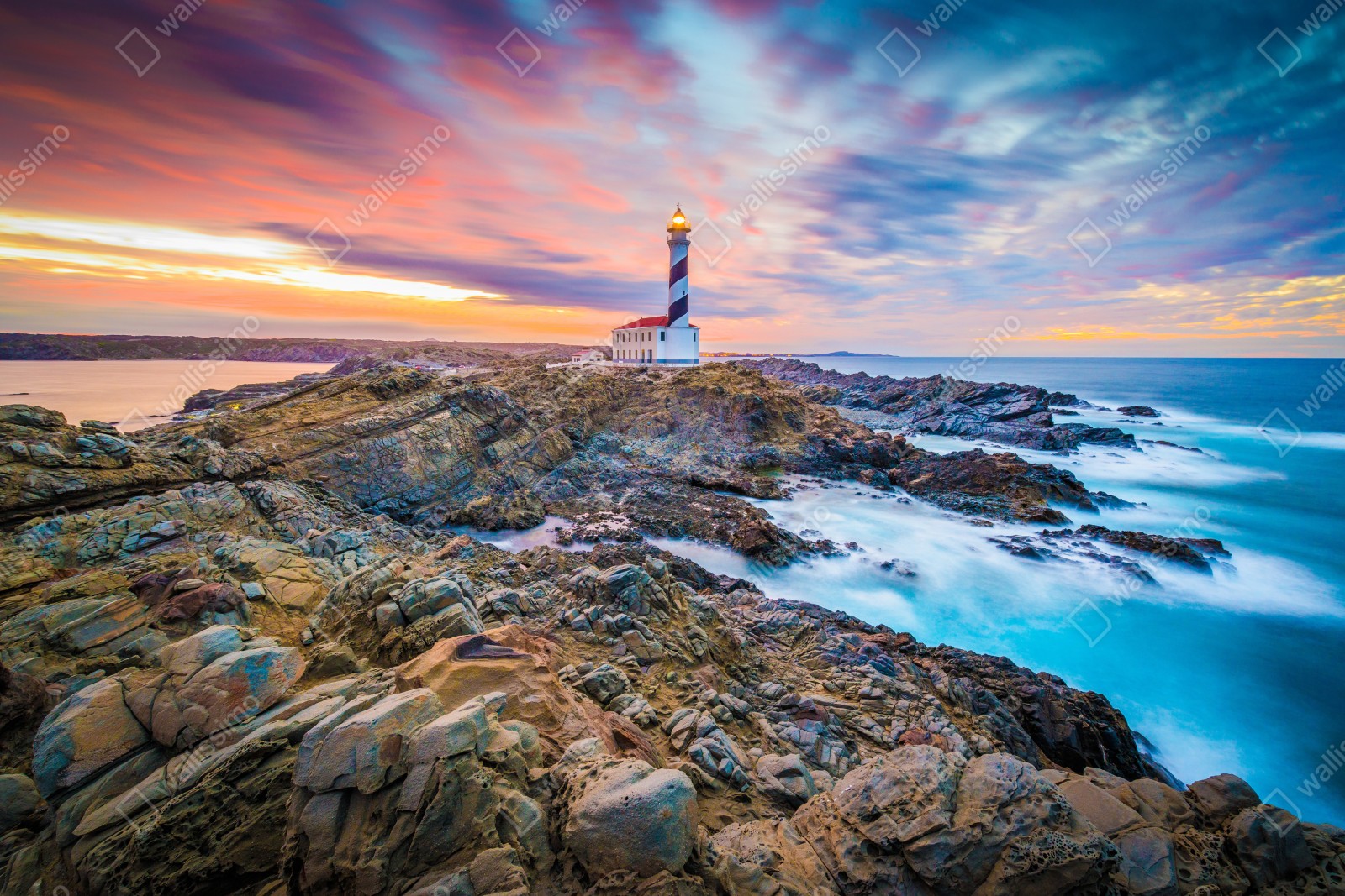 Bringen Sie maritime Ruhe in Ihr Zuhause mit einem dramatischen Sonnenuntergang bei dem Leuchtturm Favaritx auf Menorca, mit leuchtenden Himmelsfarben und schroffen Felsen.