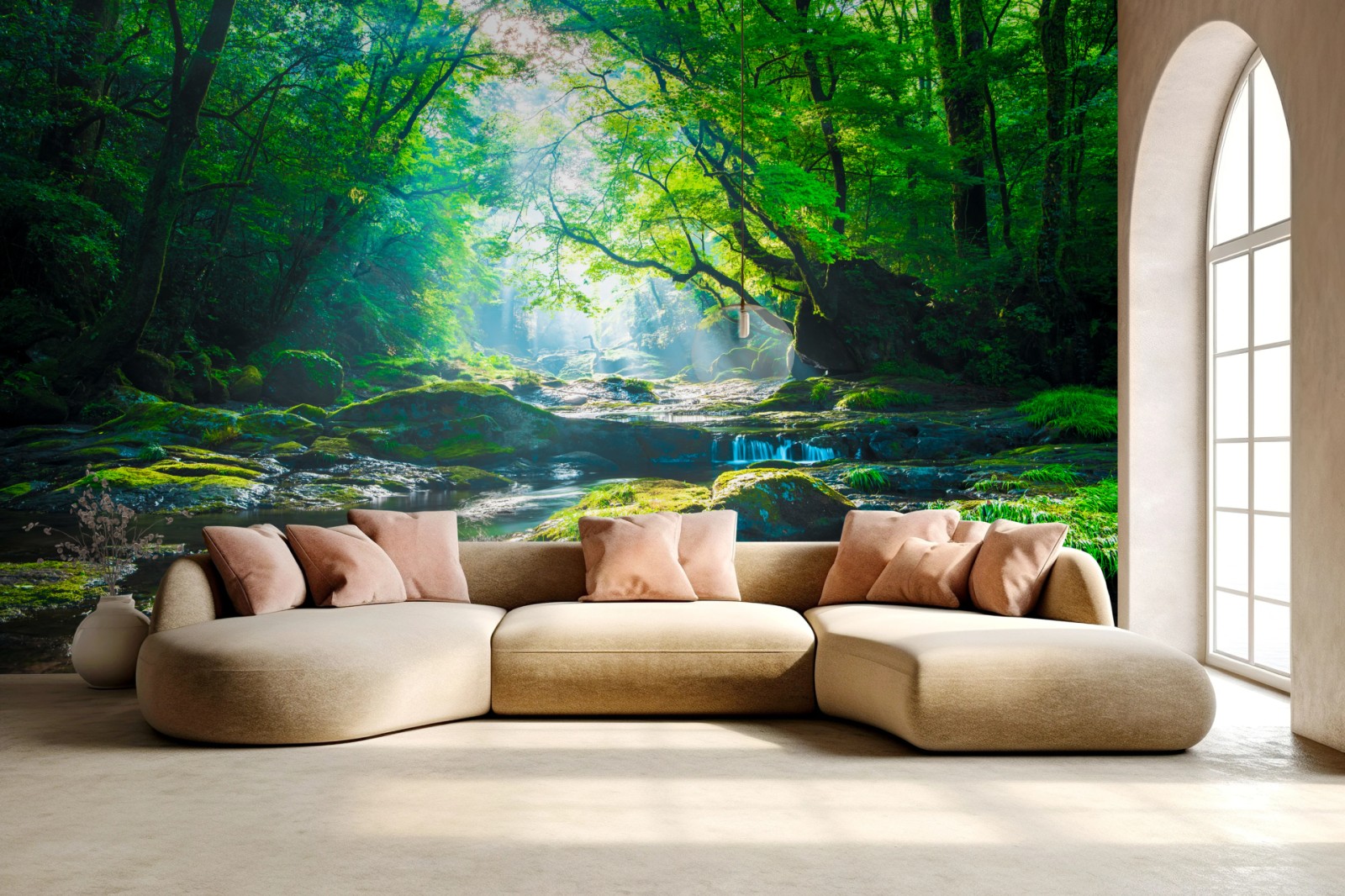 Fototapete Sonnendurchfluteter waldbach mit moosbedeckten steinen