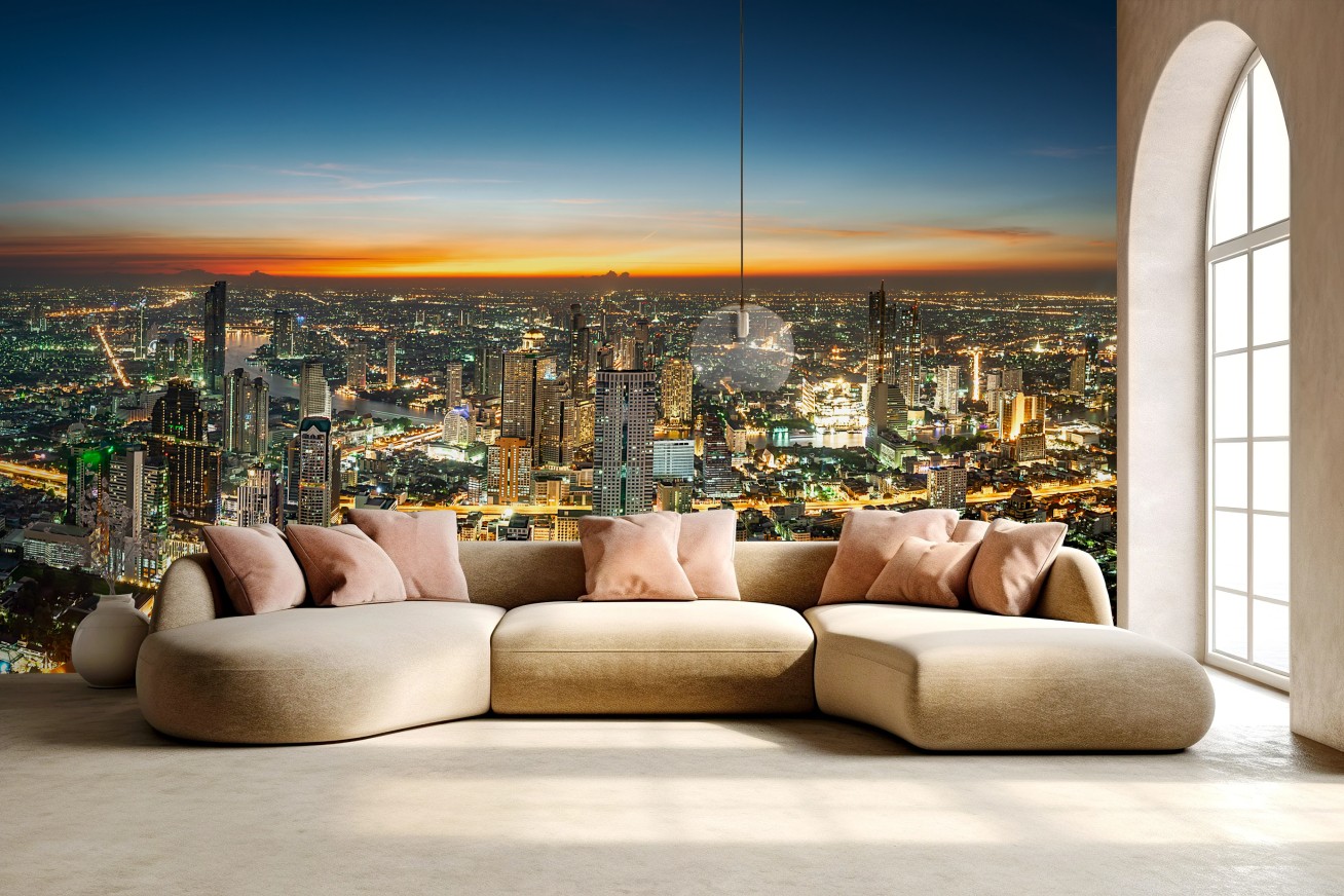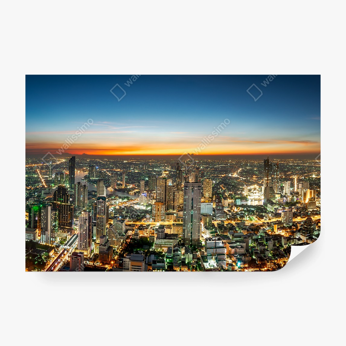 Weite nächtliche Panoramaansicht von Bangkok am Chao Phraya mit funkelnden Lichtern und dramatischem Abendhimmel, perfekt um Räumen urbanes Flair zu verleihen.MehrWeniger