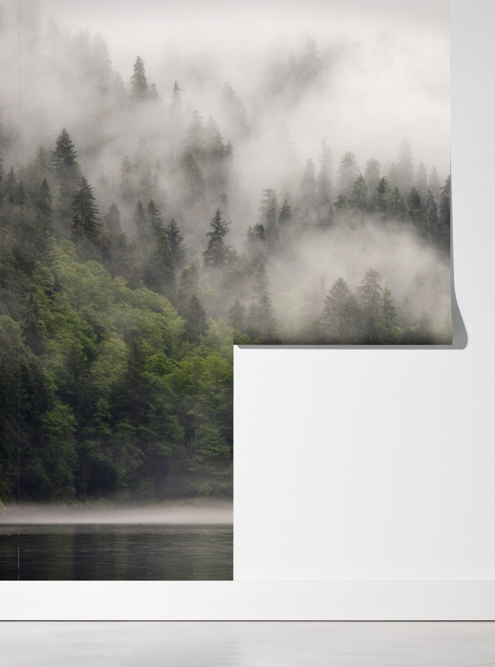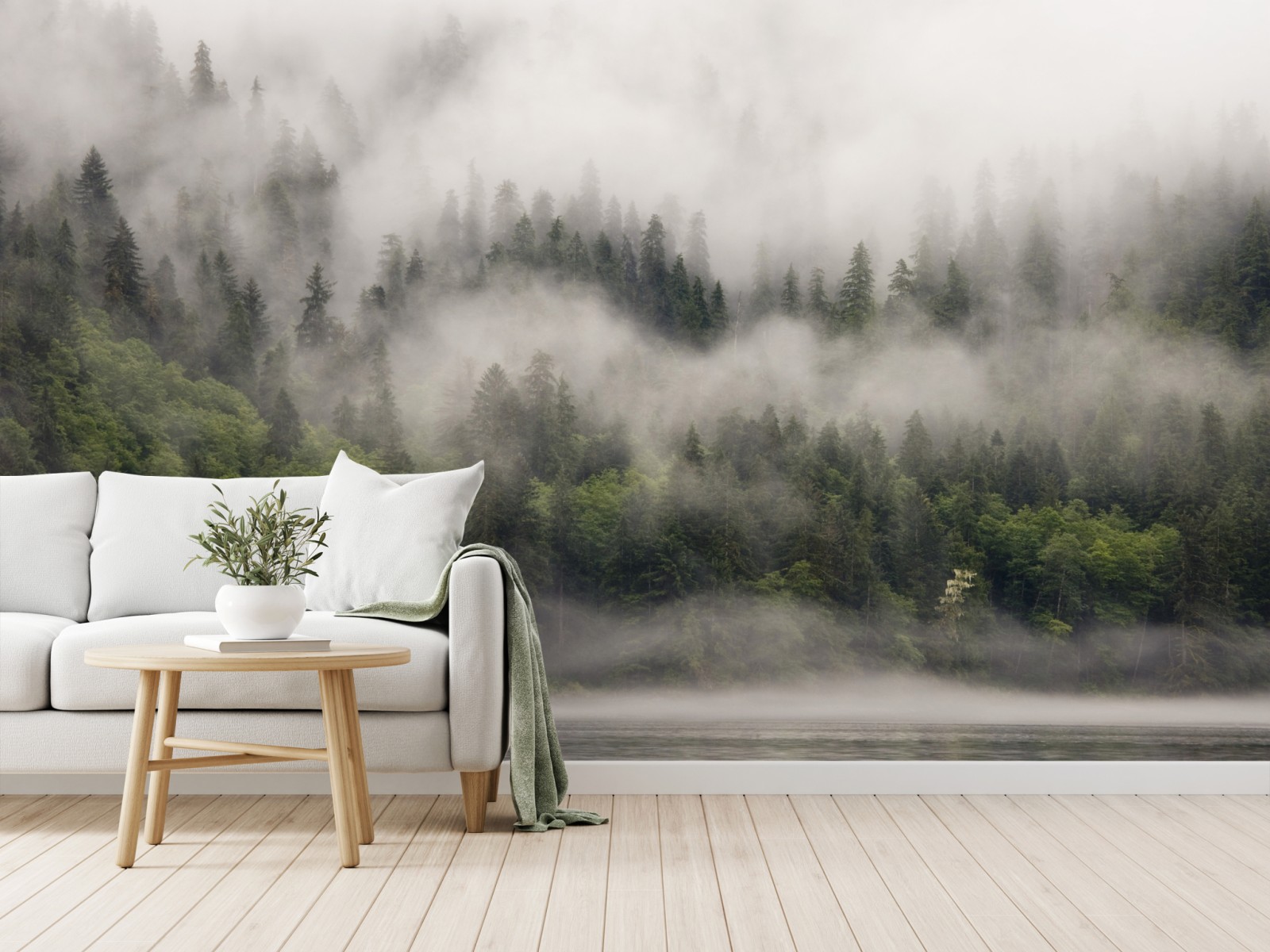 Eine beruhigende nebelige Waldlandschaft an einer Küstenbucht in British Columbia, perfekt, um natürliche Ruhe in Ihr Zuhause zu bringen.