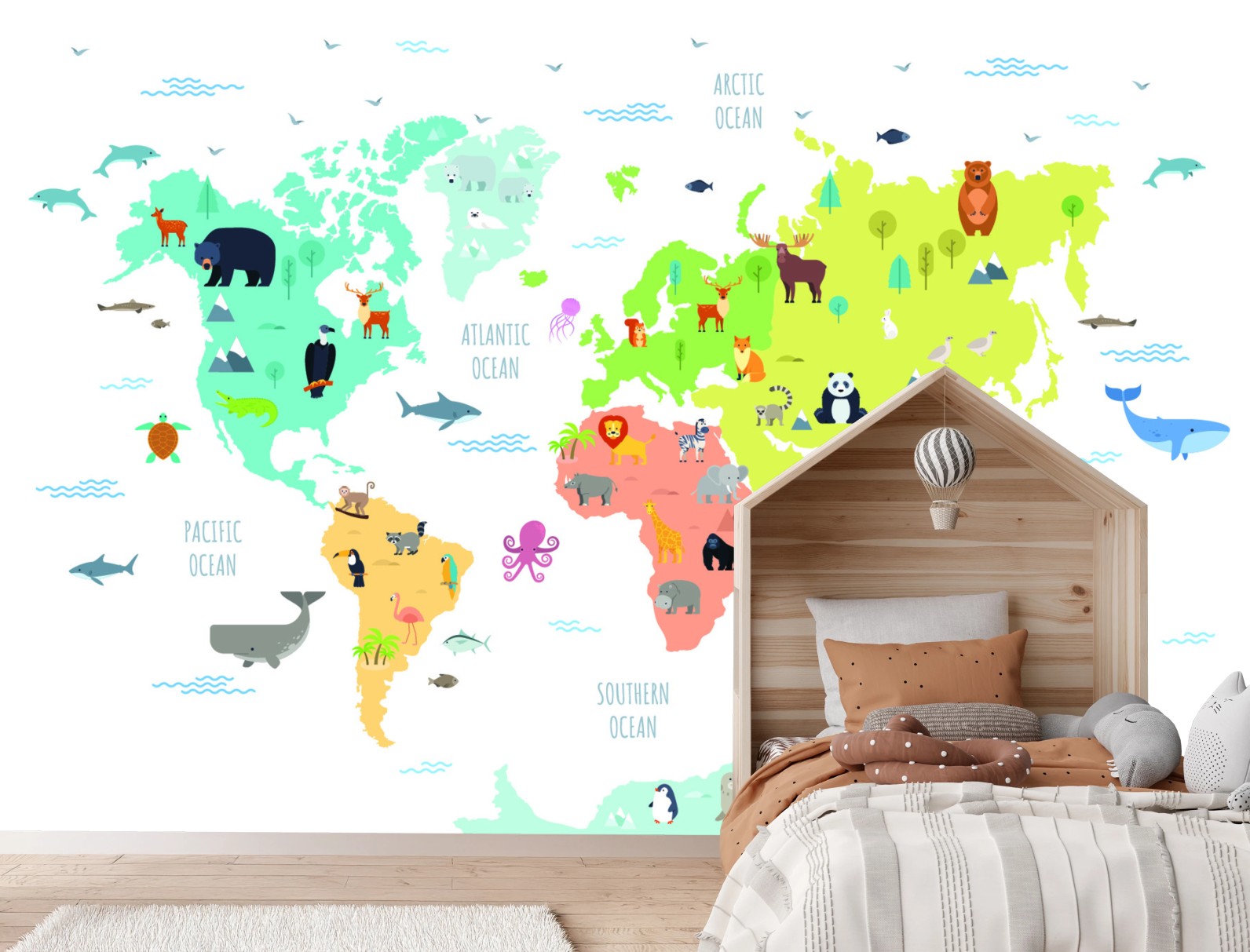 Fototapete Illustrierte weltkarte mit tieren für kinder