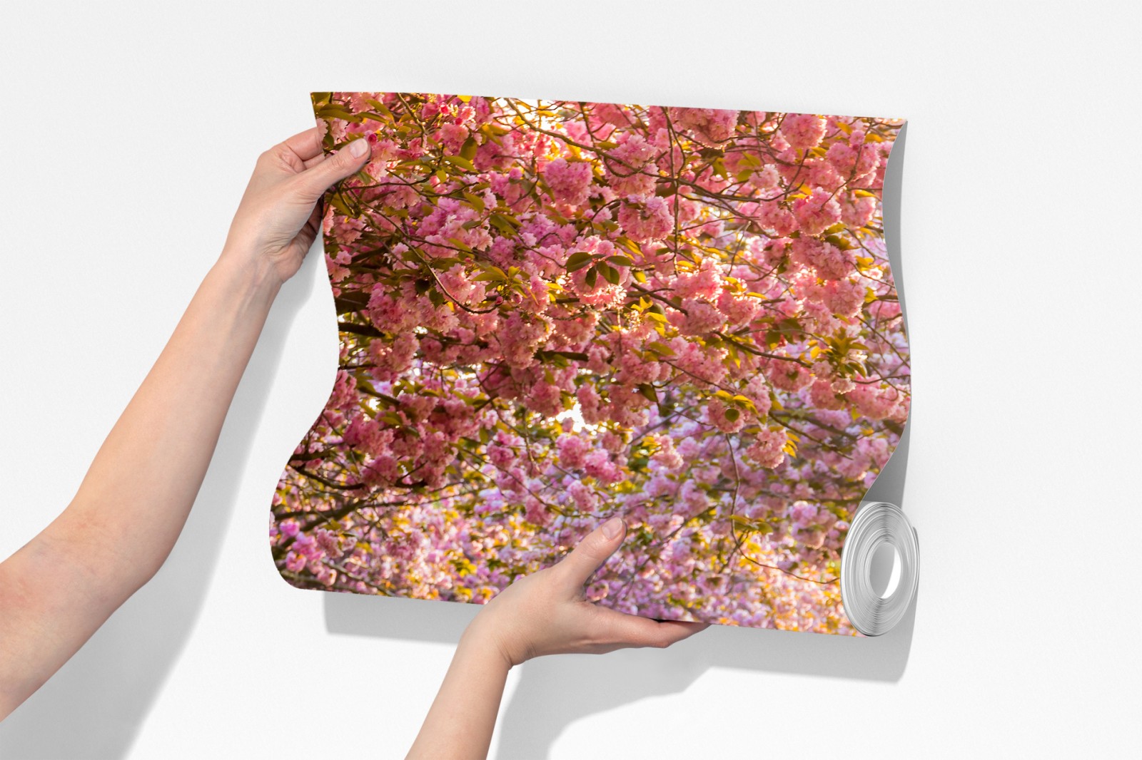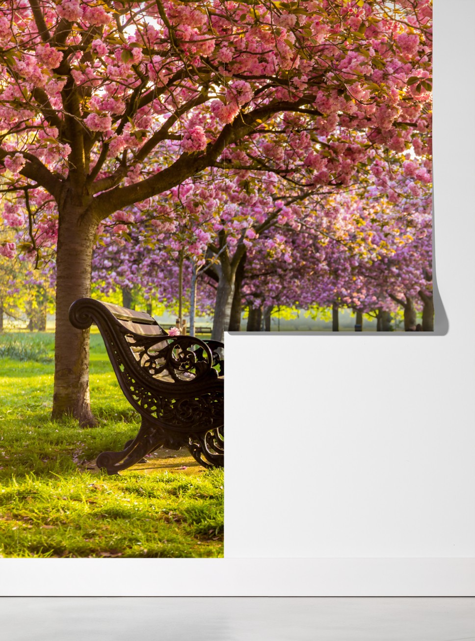 Bringen Sie die friedliche Schönheit eines sonnenbeschienenen Kirschblütenwegs mit dieser lebendigen Frühlingsszene in Ihr Zuhause.