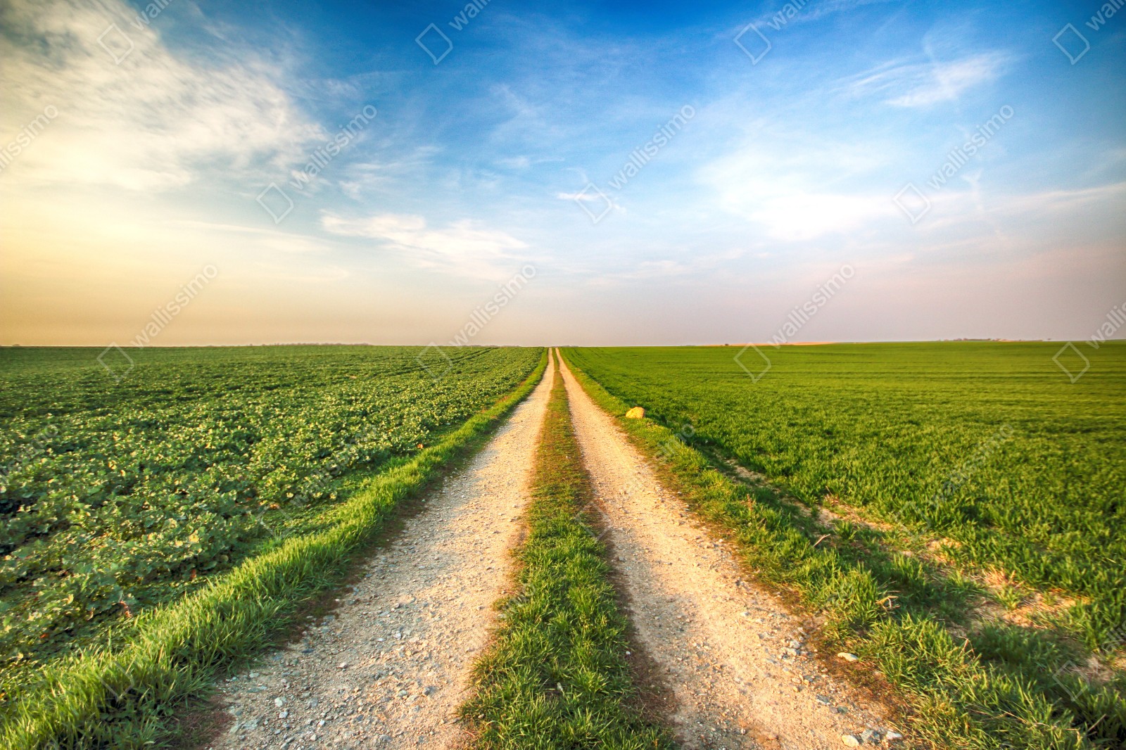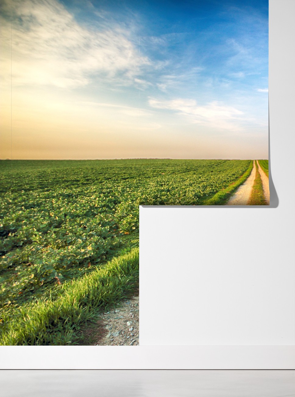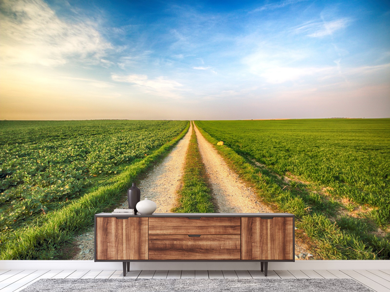 Bringen Sie ruhigen Landhauscharme an Ihre Wände mit einem sonnenbeschienenen Feldweg, der sich durch leuchtend grüne Felder unter weitem Himmel zieht.