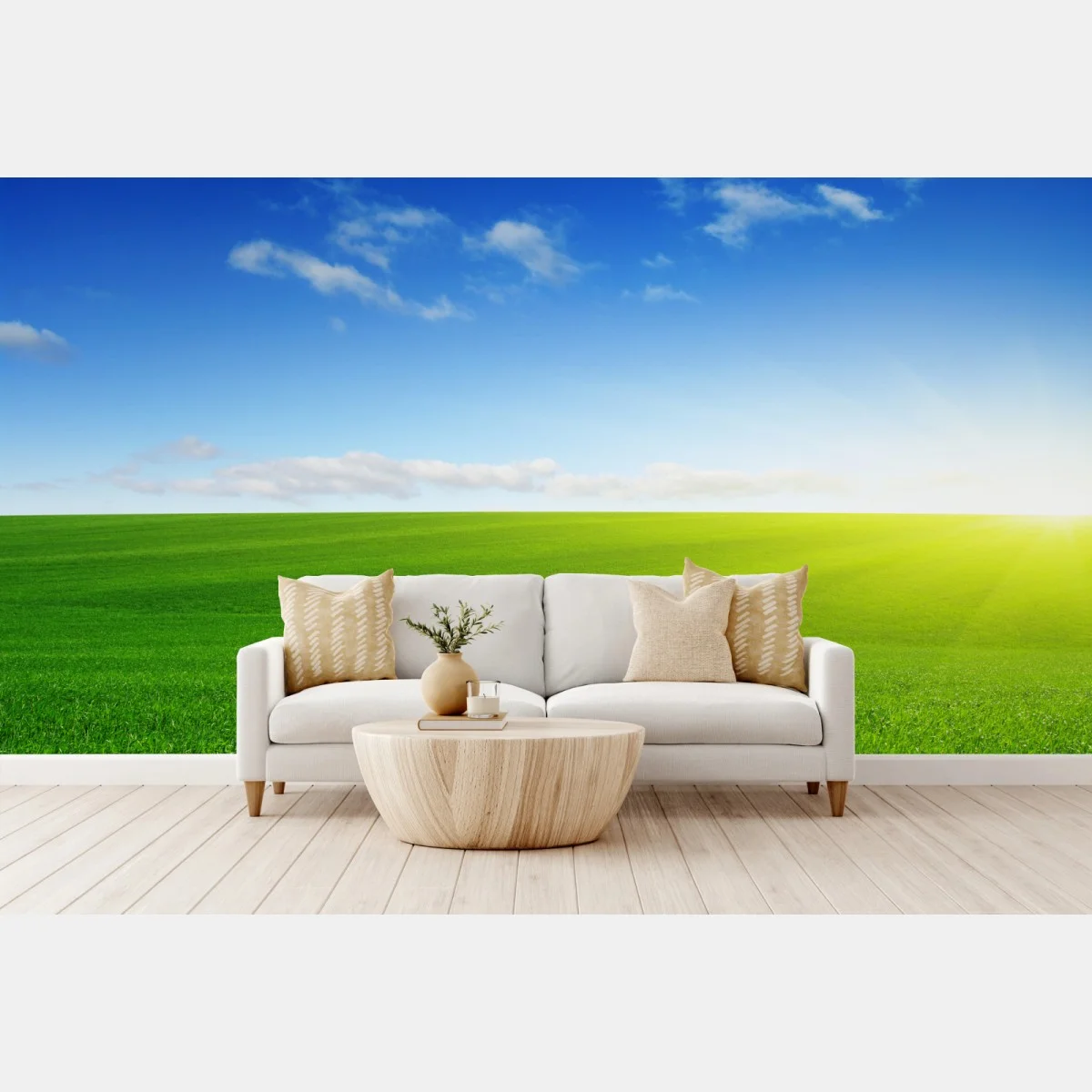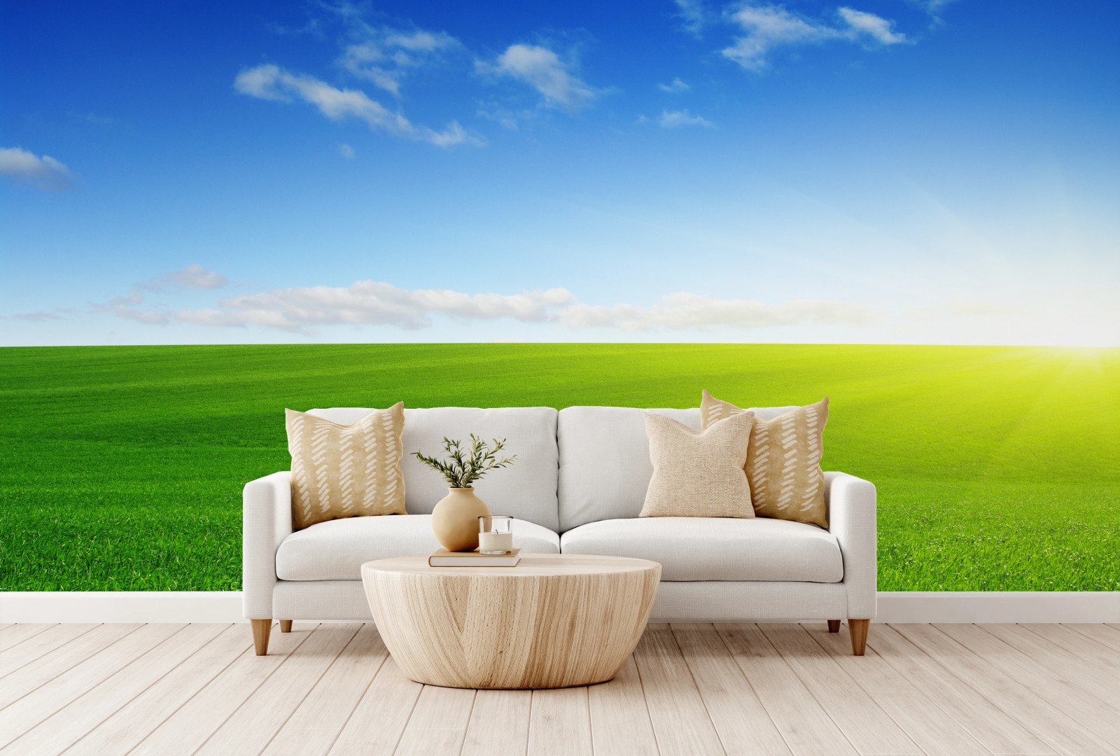 Fototapete Sonnenbeschienene grüne wiese im morgenlicht