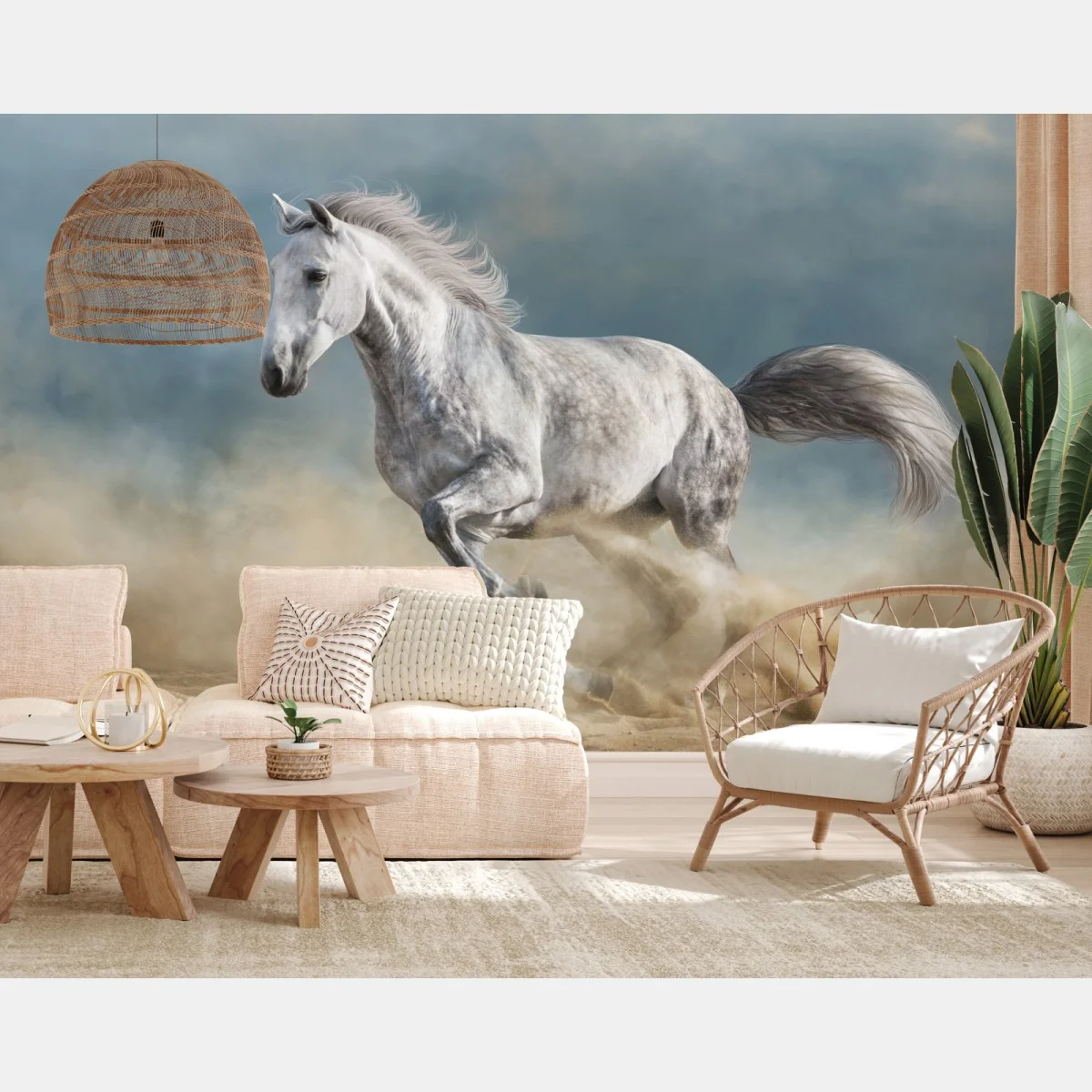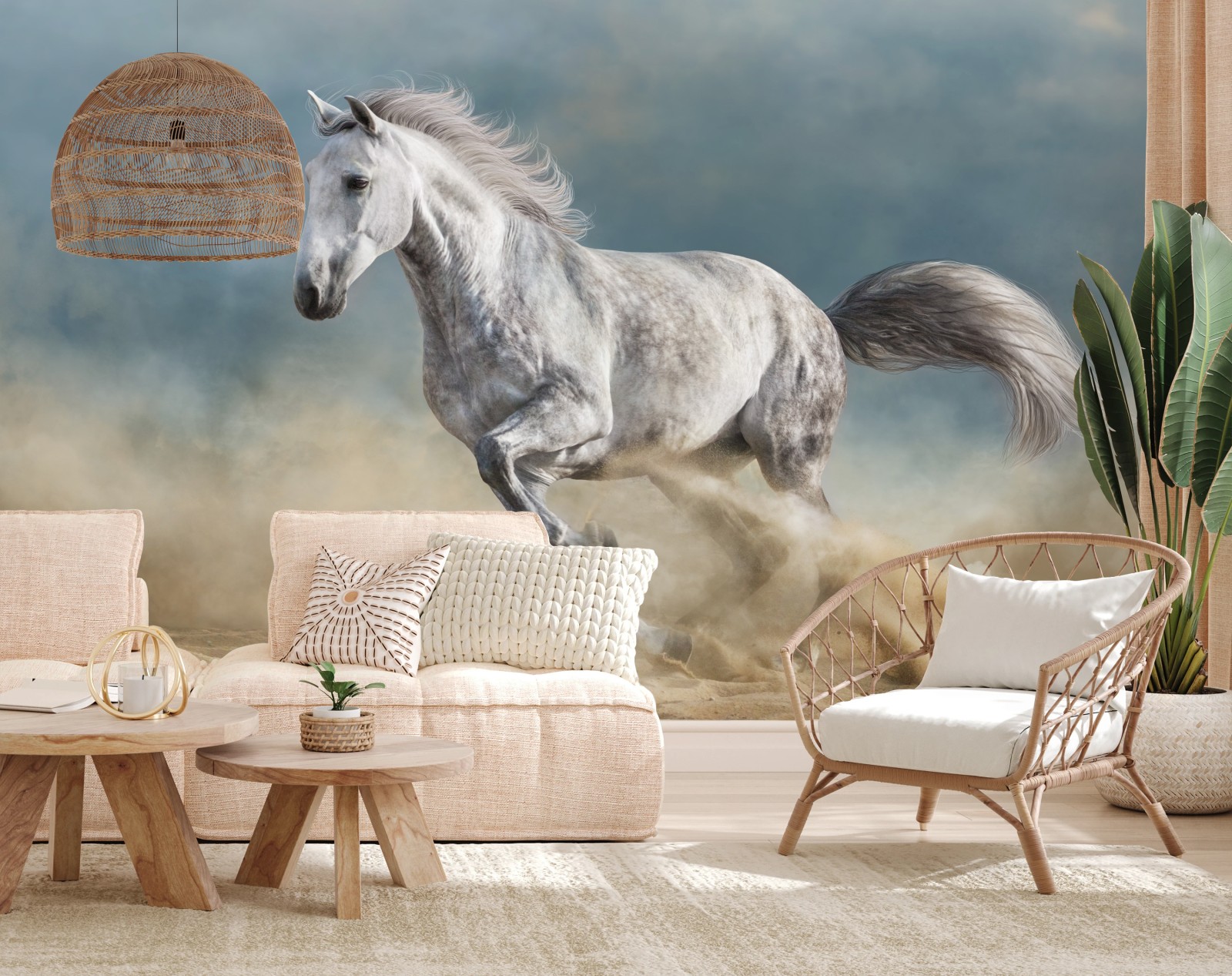 Fototapete Majestätisches graues pferd galoppiert durch den sand