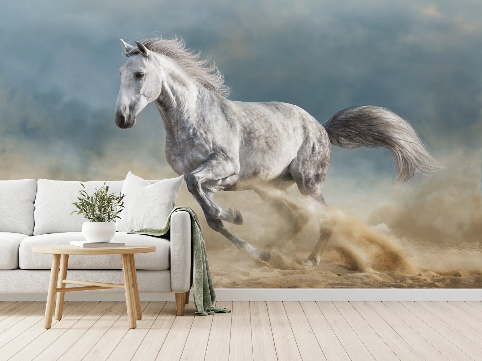Fototapete Majestätisches graues pferd galoppiert durch den sand
