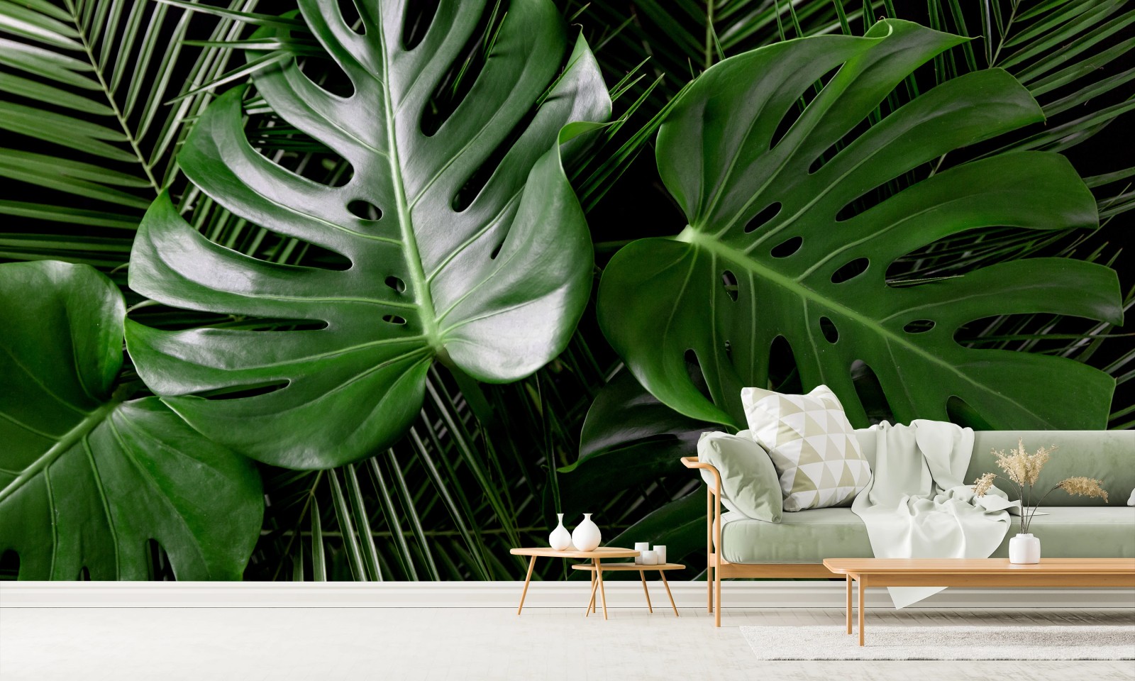 Bringen Sie tropisches Flair in Ihr Zuhause mit leuchtenden Monstera- und Palmenblättern vor dunklem Hintergrund.MehrWeniger