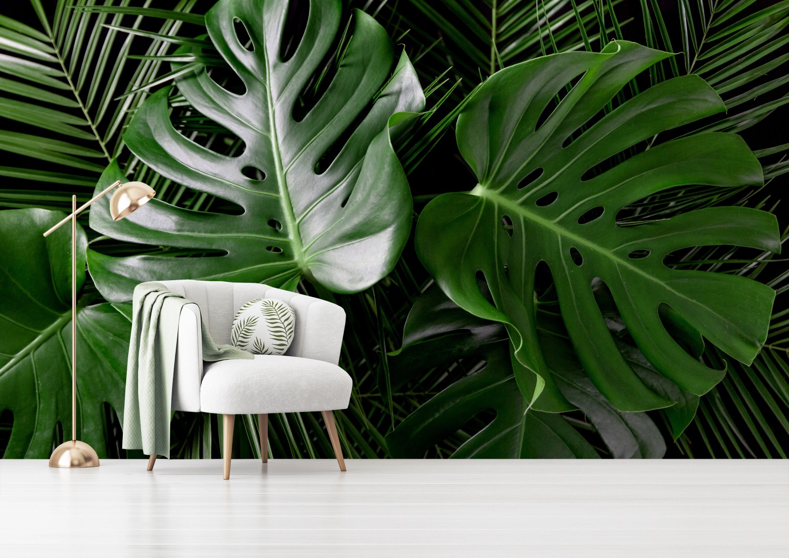 Bringen Sie tropisches Flair in Ihr Zuhause mit leuchtenden Monstera- und Palmenblättern vor dunklem Hintergrund.MehrWeniger