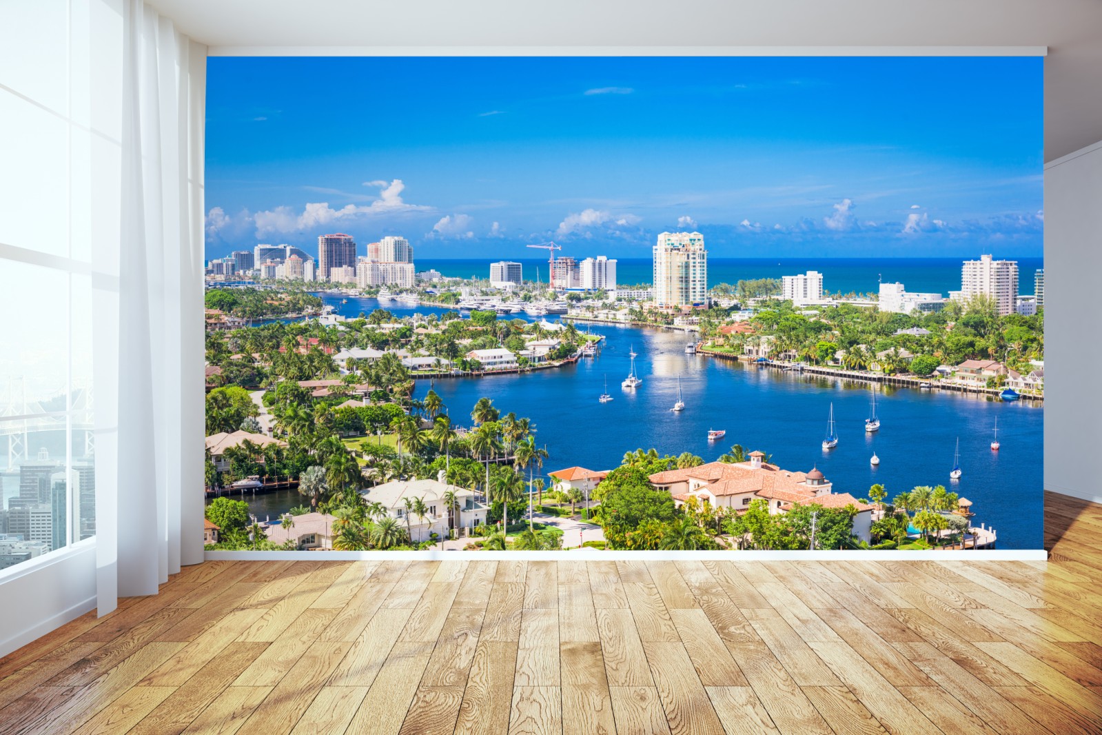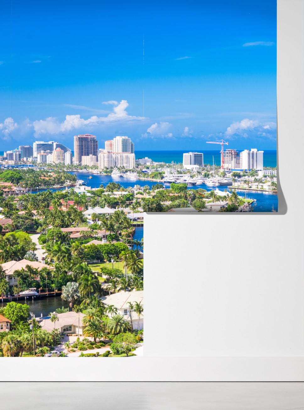 Bringen Sie maritimen Flair in Ihr Zuhause mit einer lebendigen Luftaufnahme von Fort Lauderdale, der Marina und Yachten unter klarem, blauem Himmel.