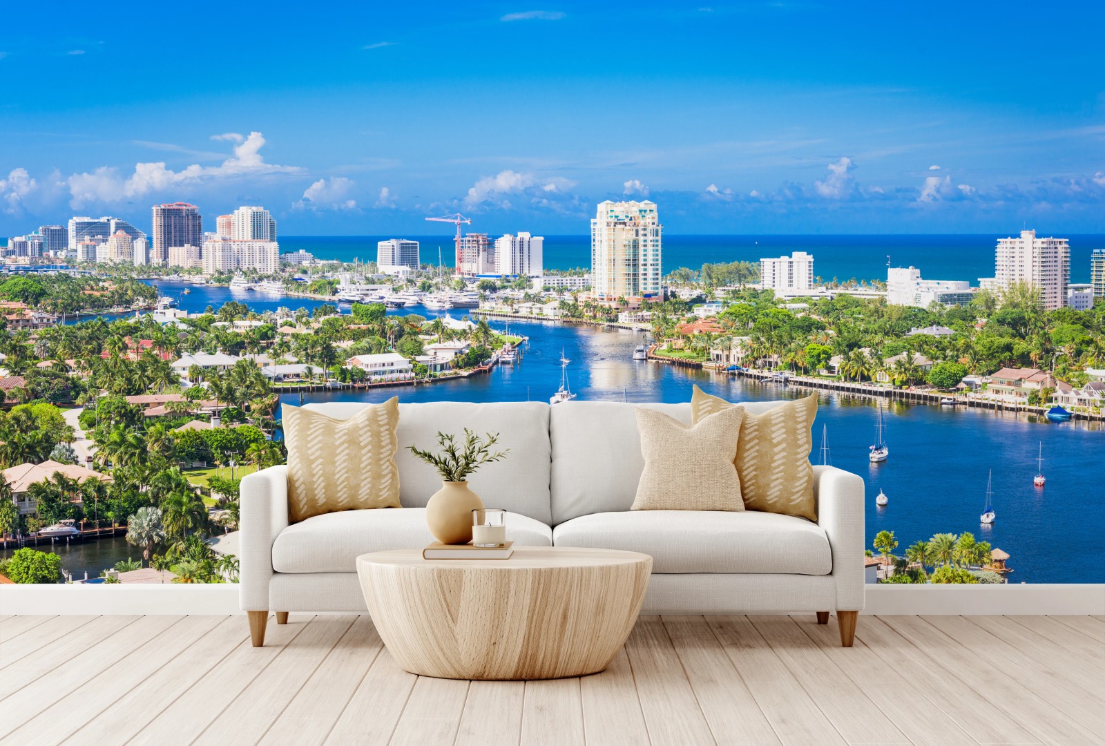 Bringen Sie maritimen Flair in Ihr Zuhause mit einer lebendigen Luftaufnahme von Fort Lauderdale, der Marina und Yachten unter klarem, blauem Himmel.MehrWeniger