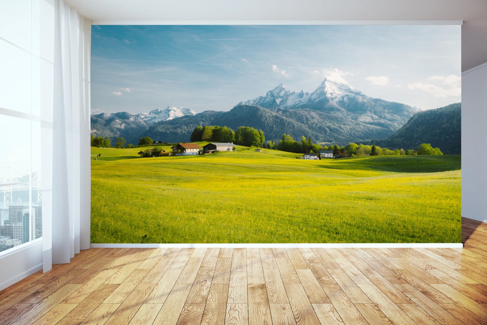 Fototapete Alpwiese unter schneebedeckten gipfeln