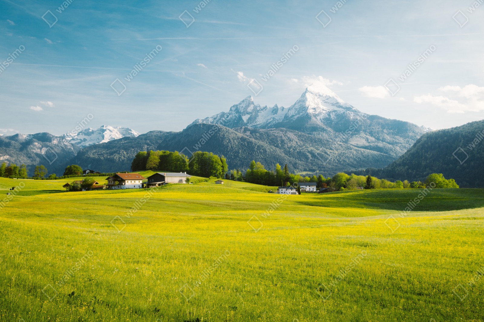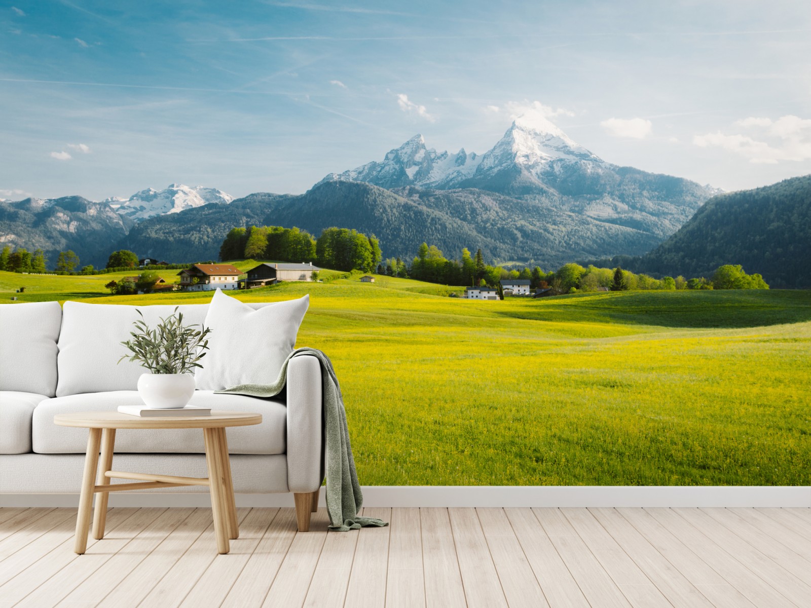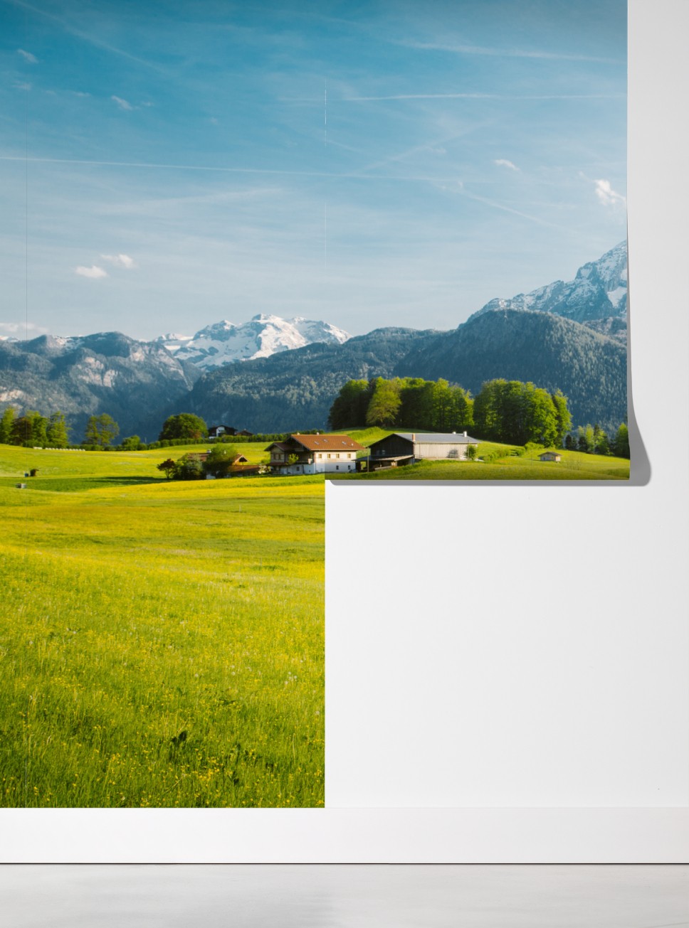 Erleben Sie ruhige Alpenlandschaft mit lebendigen Wiesen und schneebedeckten Gipfeln, die eine natürliche Ruhe in Ihr Zuhause bringen.