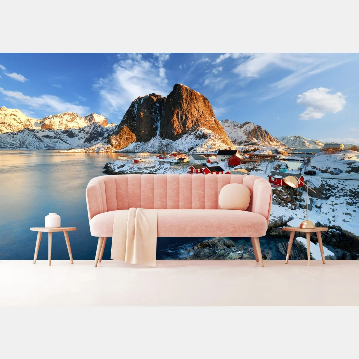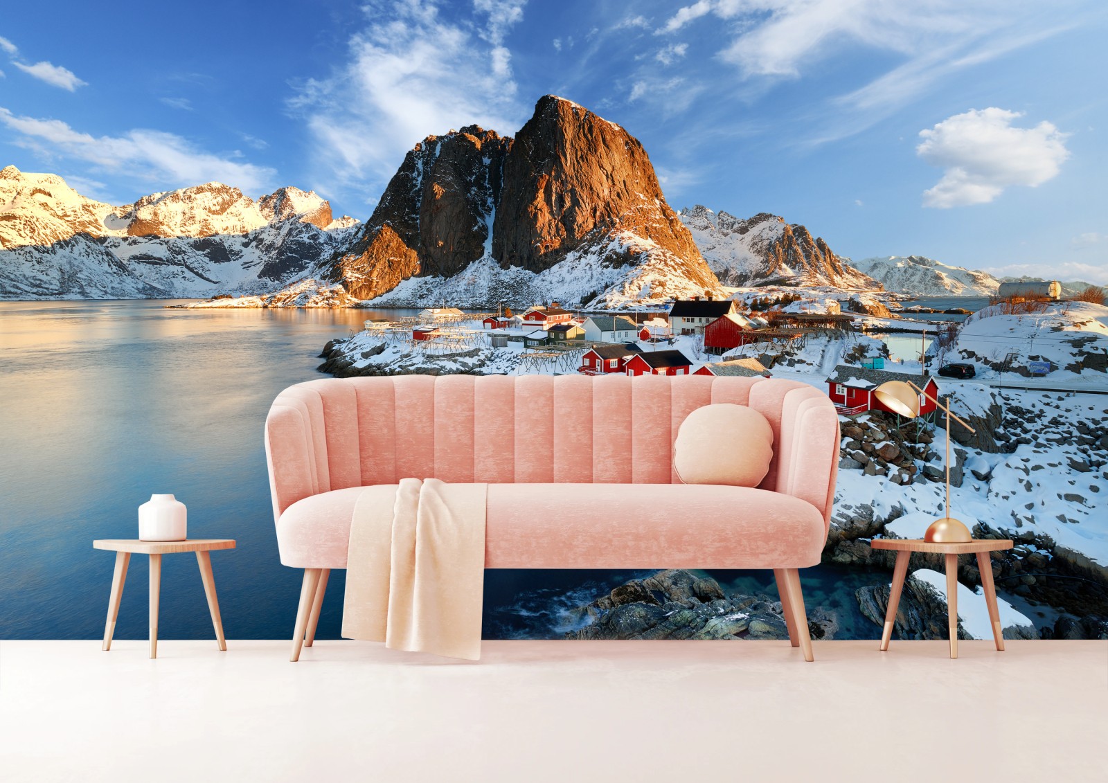 Fototapete Sonnenbeschienenes Hamnøy am fjord