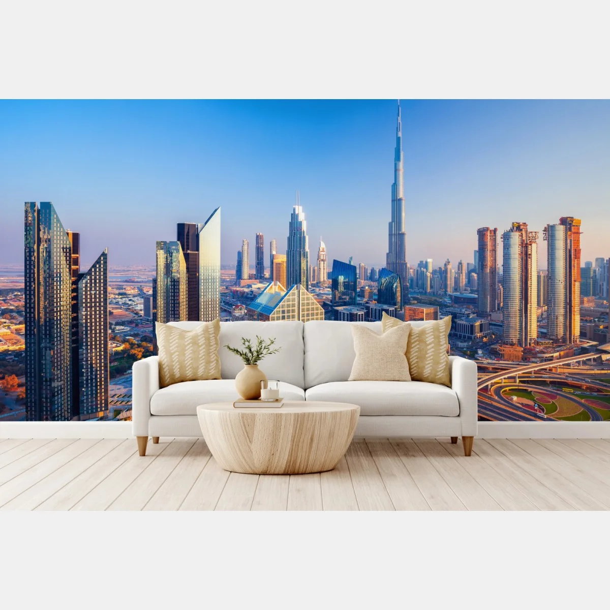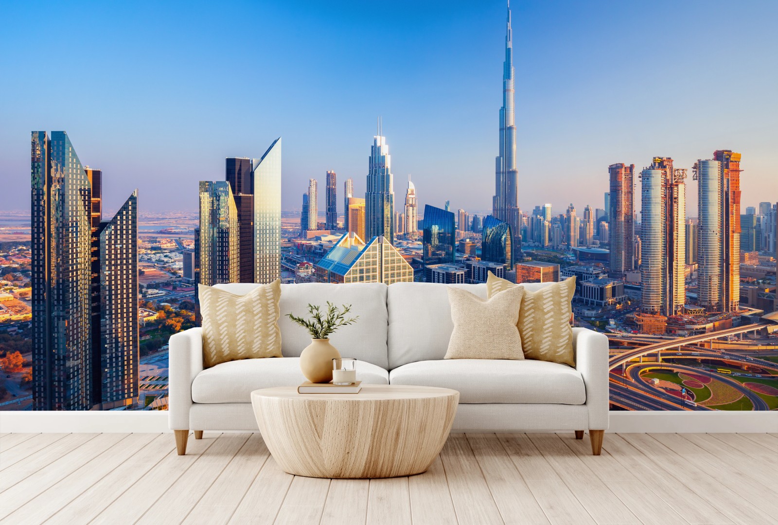 Fototapete Panorama Dubais mit Burj Khalifa bei sonnenuntergang