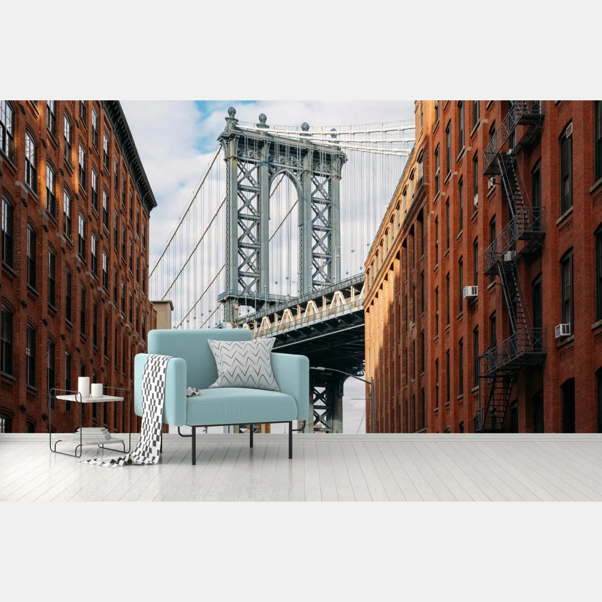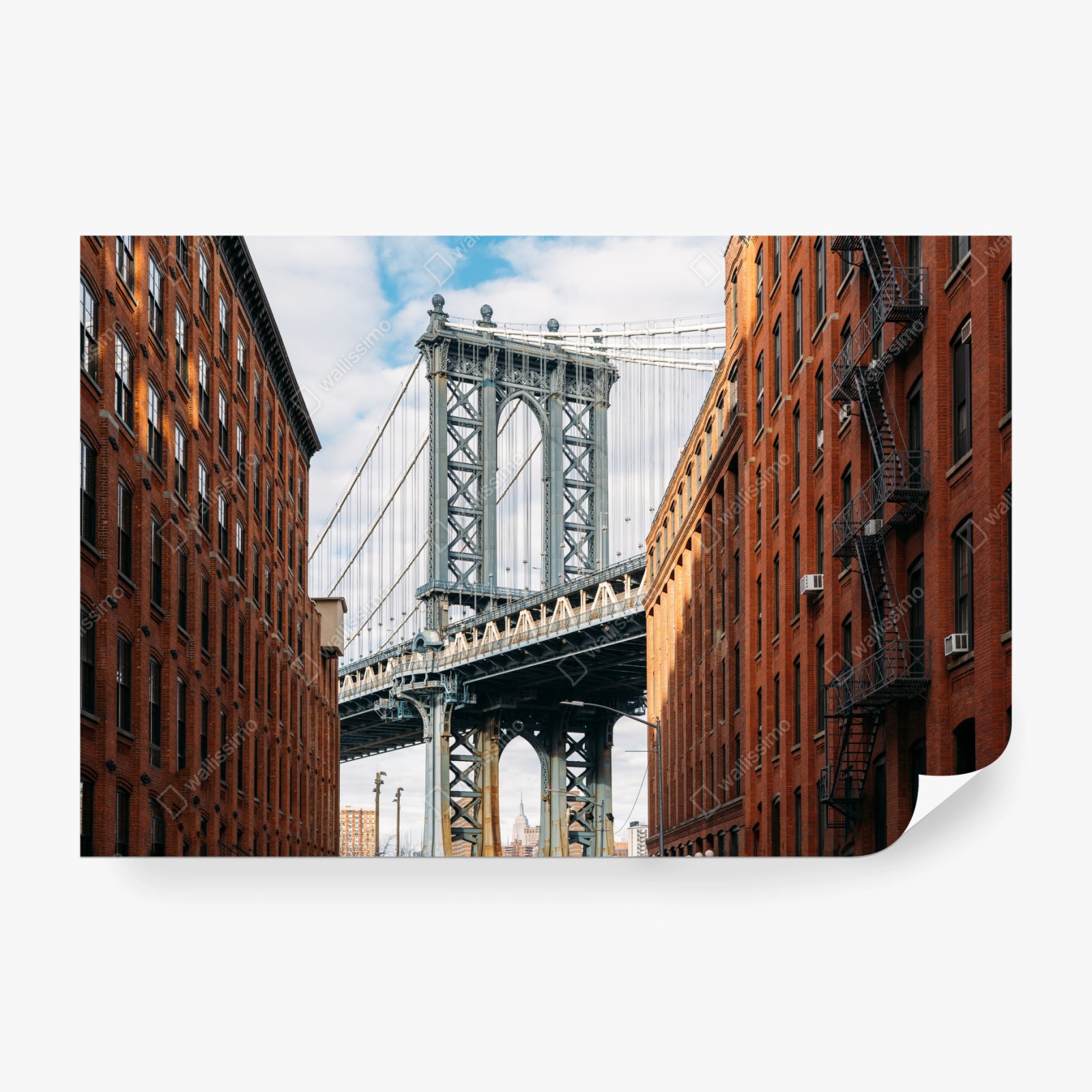 Dramatische städtische Ansicht der Brooklyn Brücke zwischen roten Backsteingebäuden, perfekt für industrielle und moderne Einrichtungsstile.MehrWeniger