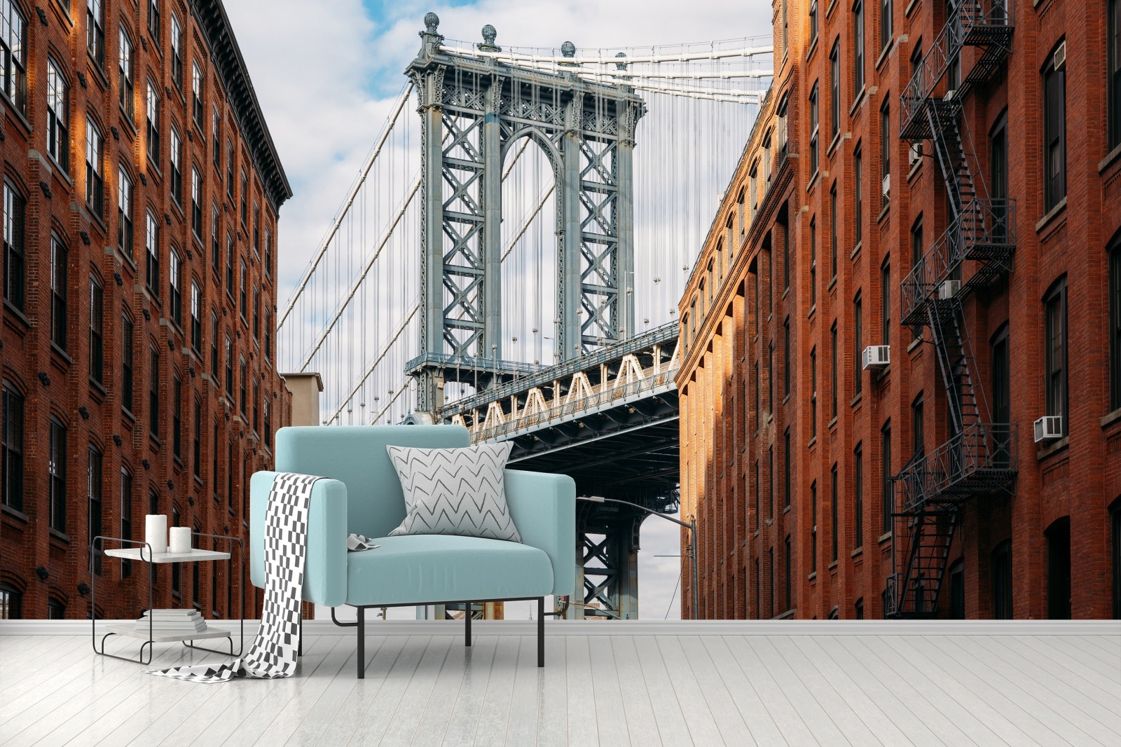 Fototapete Brooklyn brücke eingerahmt von backsteingebäuden