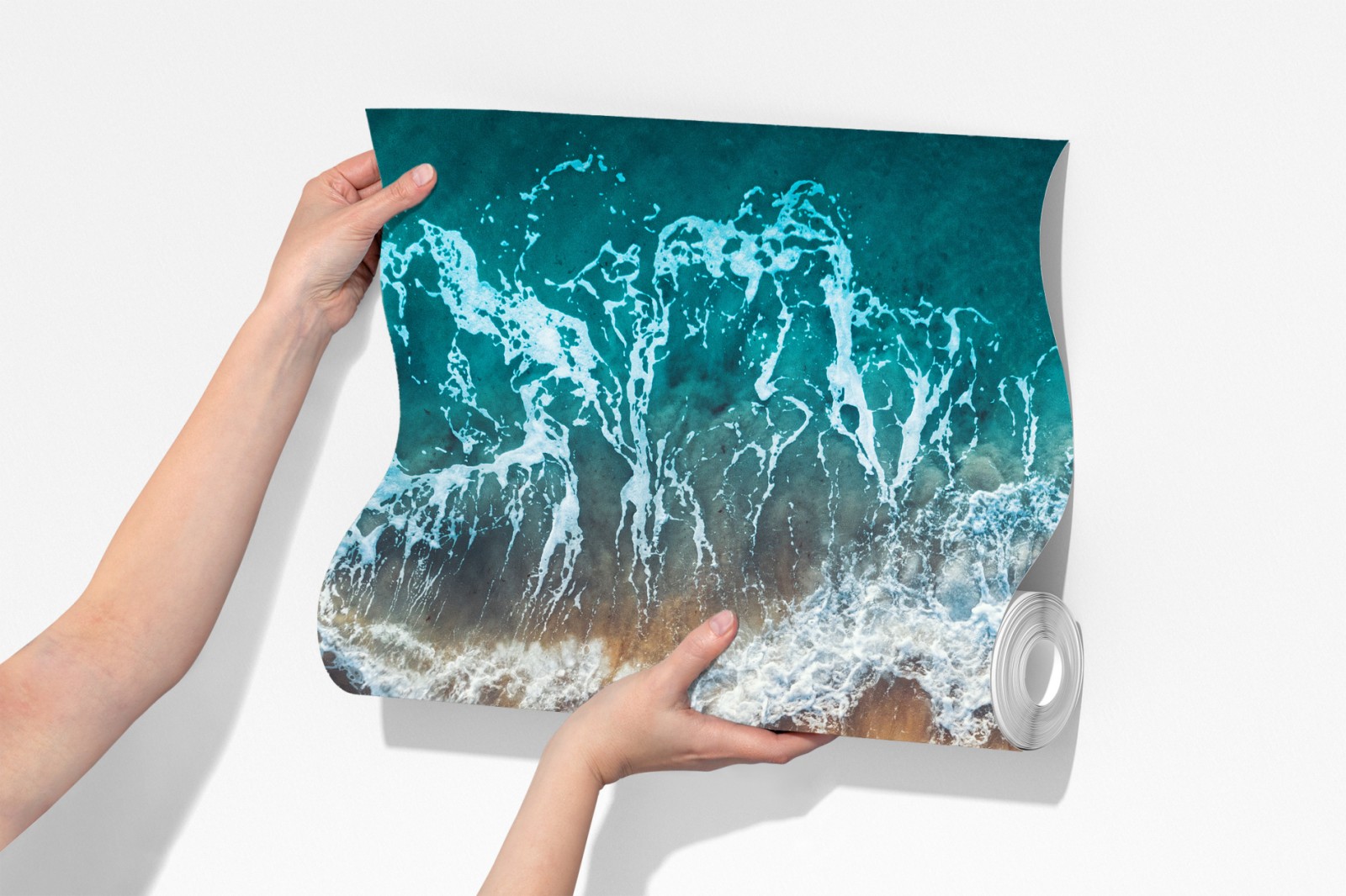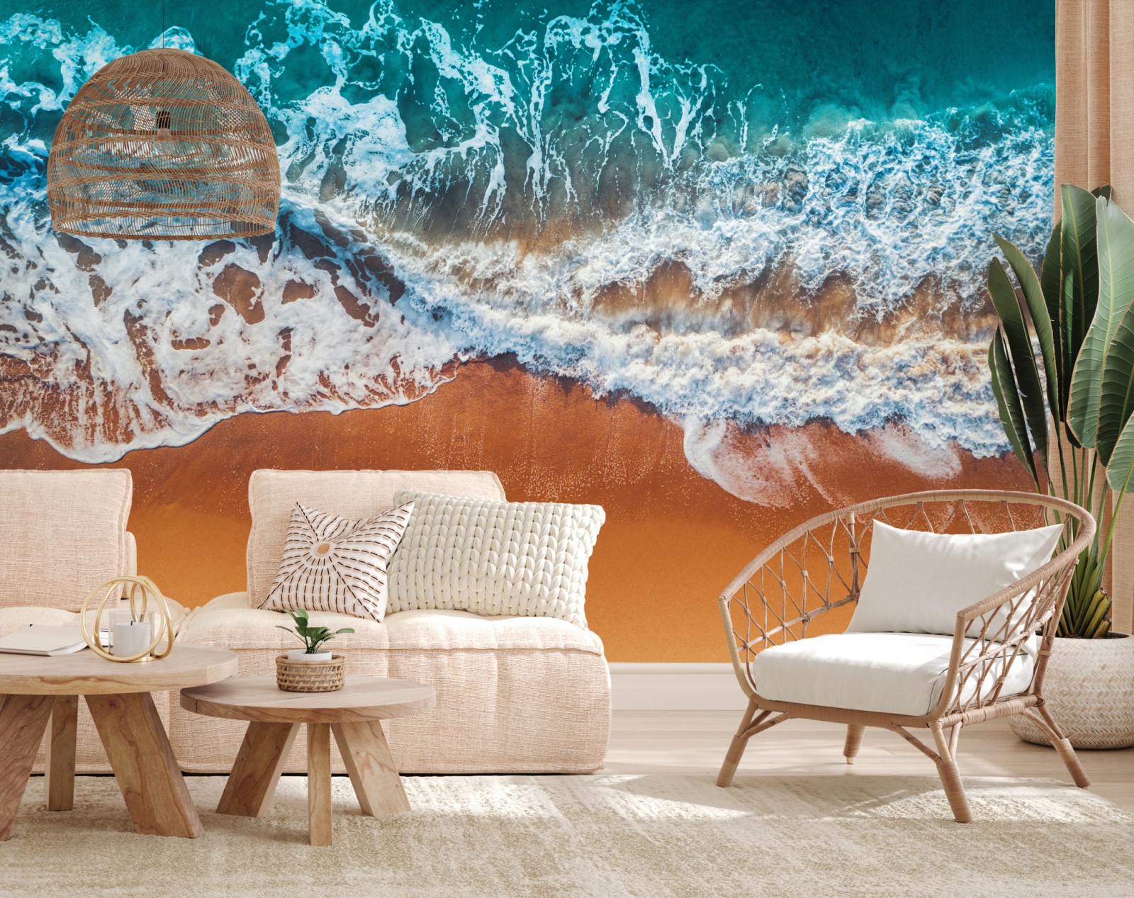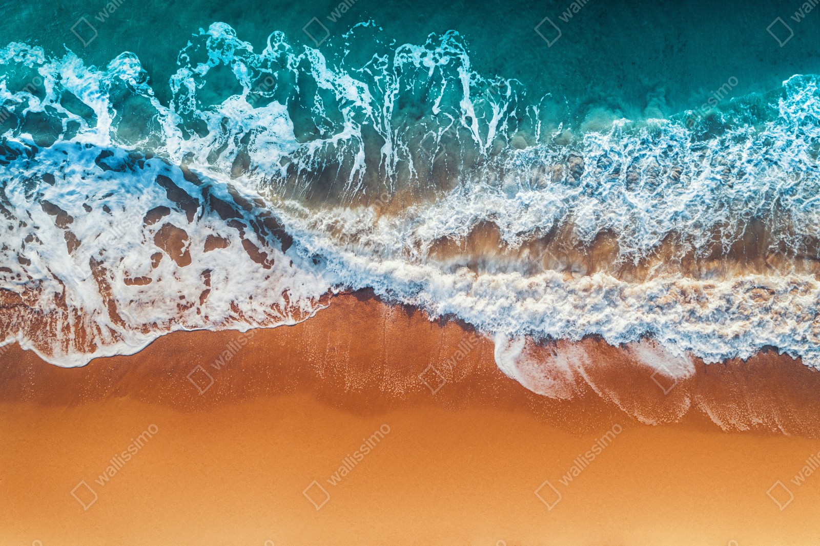 Bringen Sie beruhigende Küstenenergie in Ihr Zuhause mit dieser Luftaufnahme türkisfarbener Wellen, die an einem goldenen Sandstrand brechen.