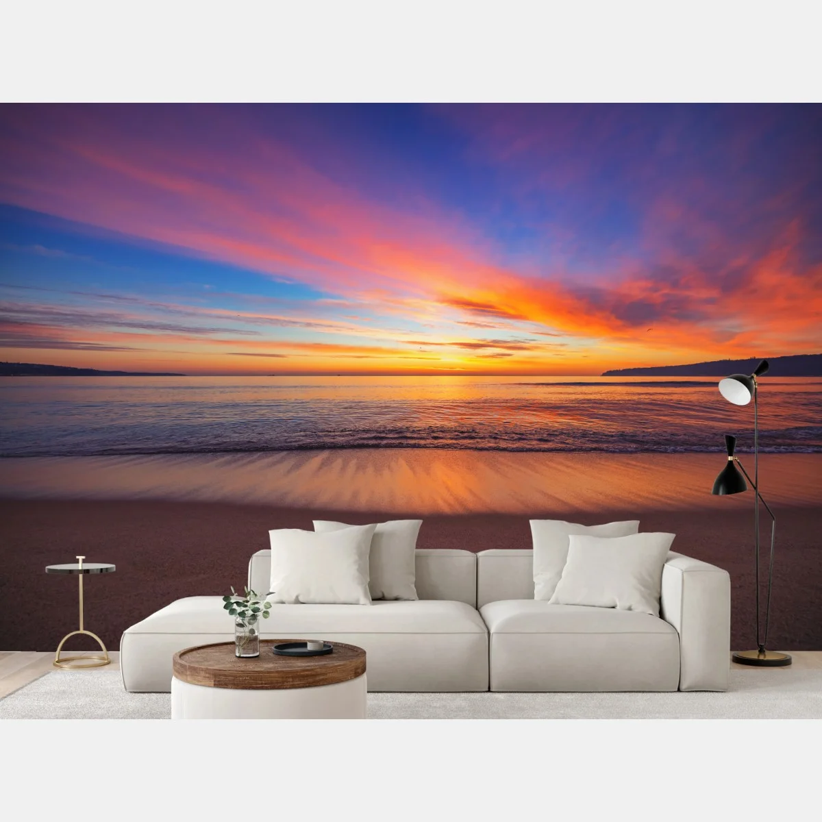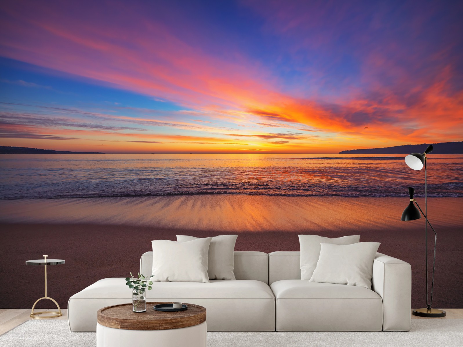 Fototapete Lebendiger sonnenaufgang über einem ruhigen strand