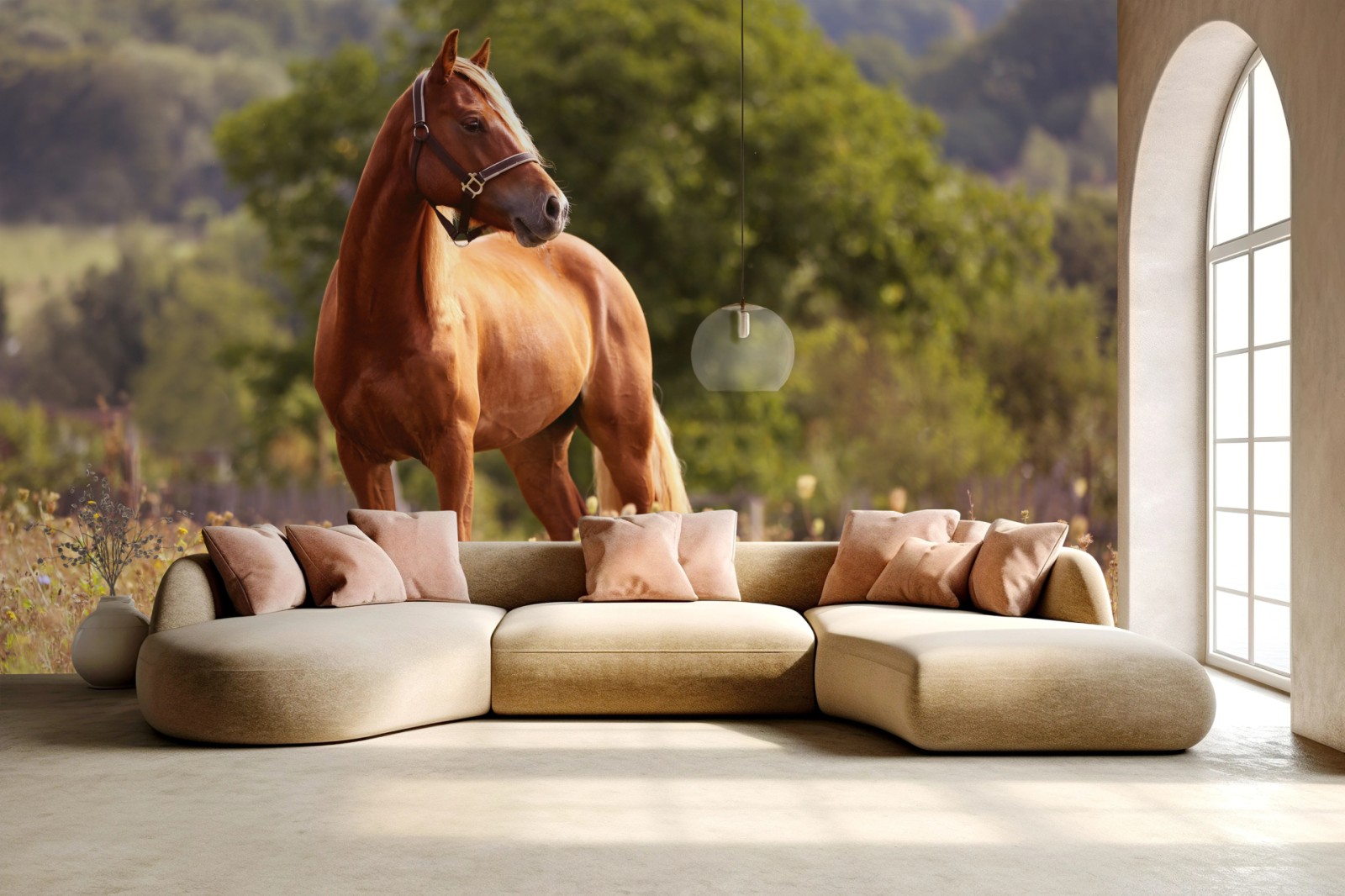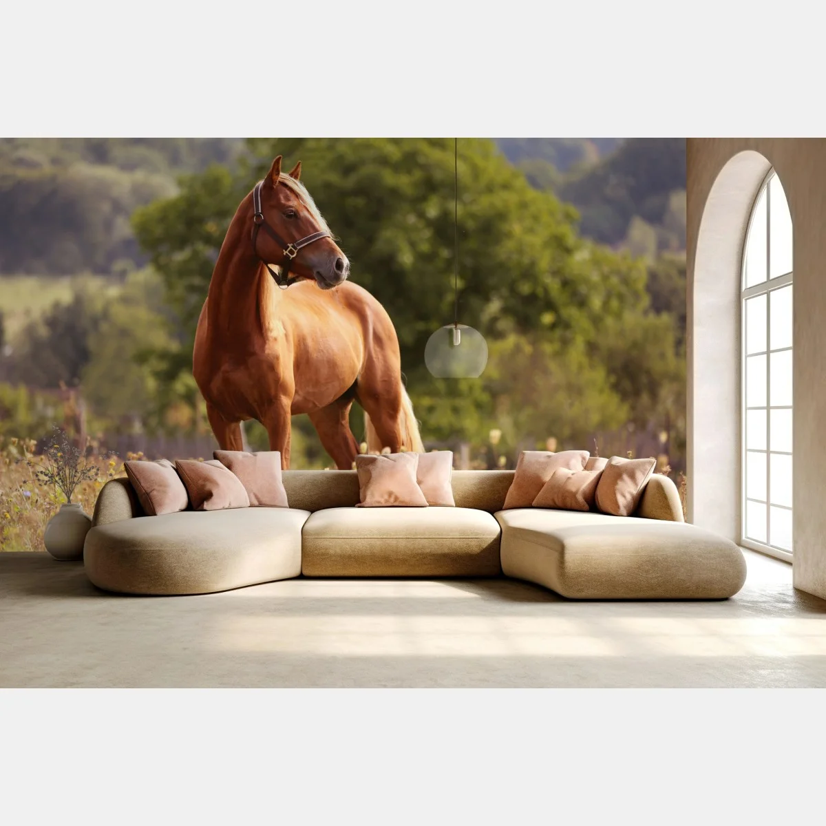 Fototapete Majestätisches kastanienbraunes pferd auf sommerlicher wiese