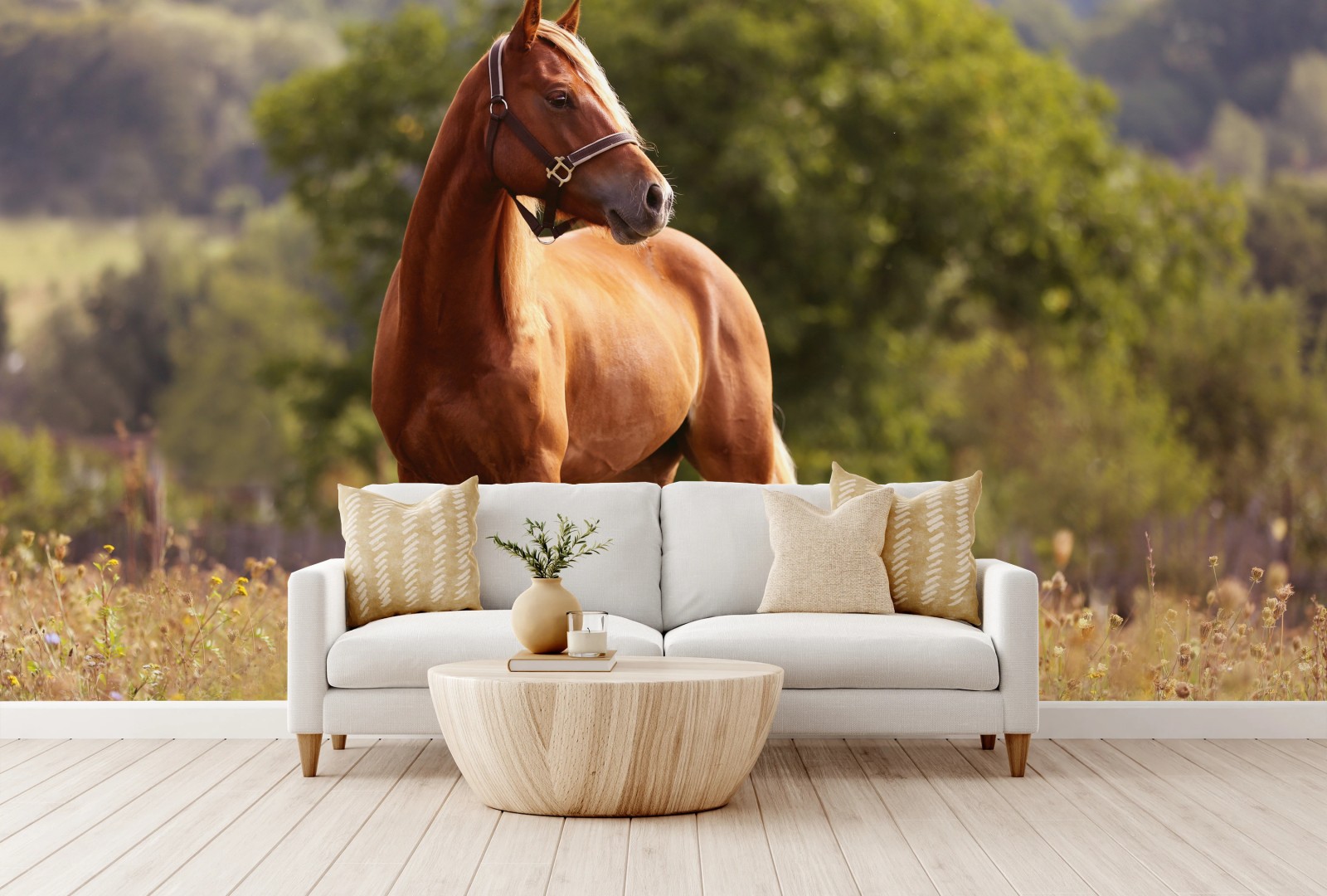 Fototapete Majestätisches kastanienbraunes pferd auf sommerlicher wiese