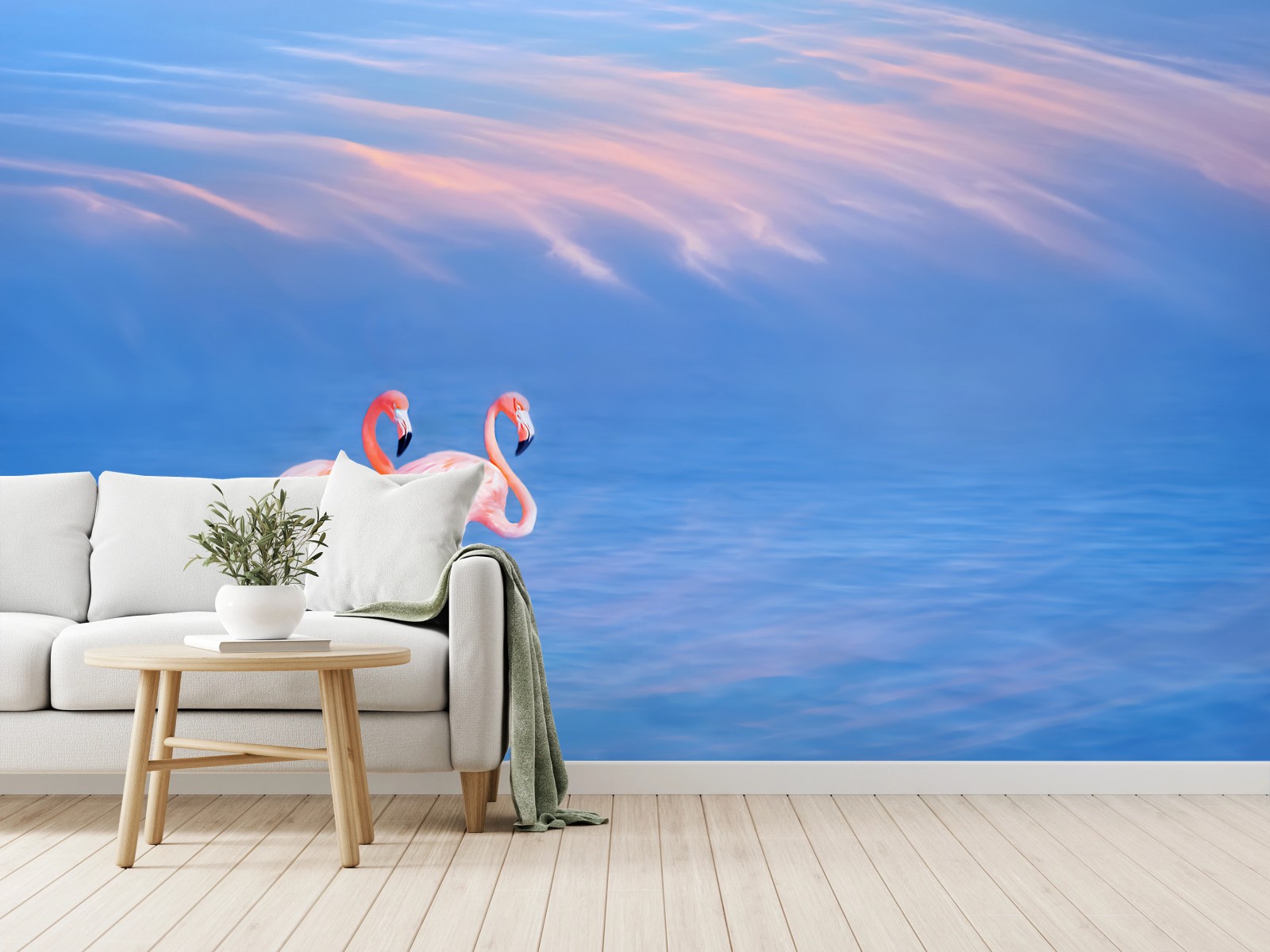 Fototapete Rosa flamingos auf pastellfarbenem wasser