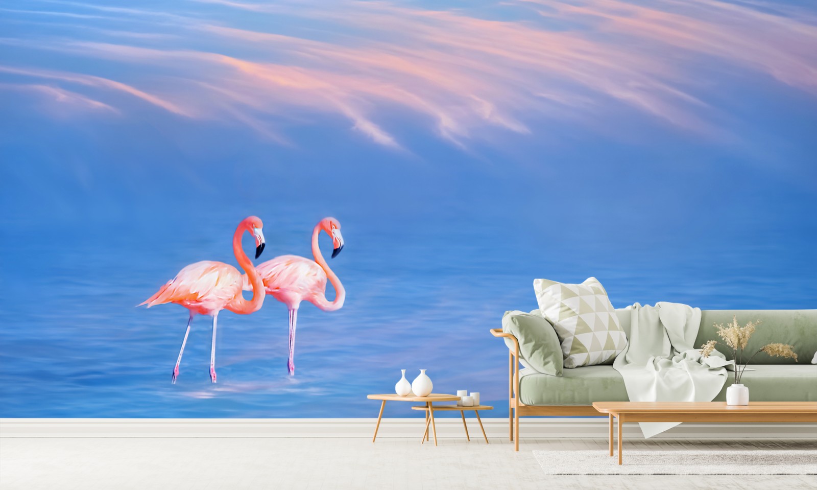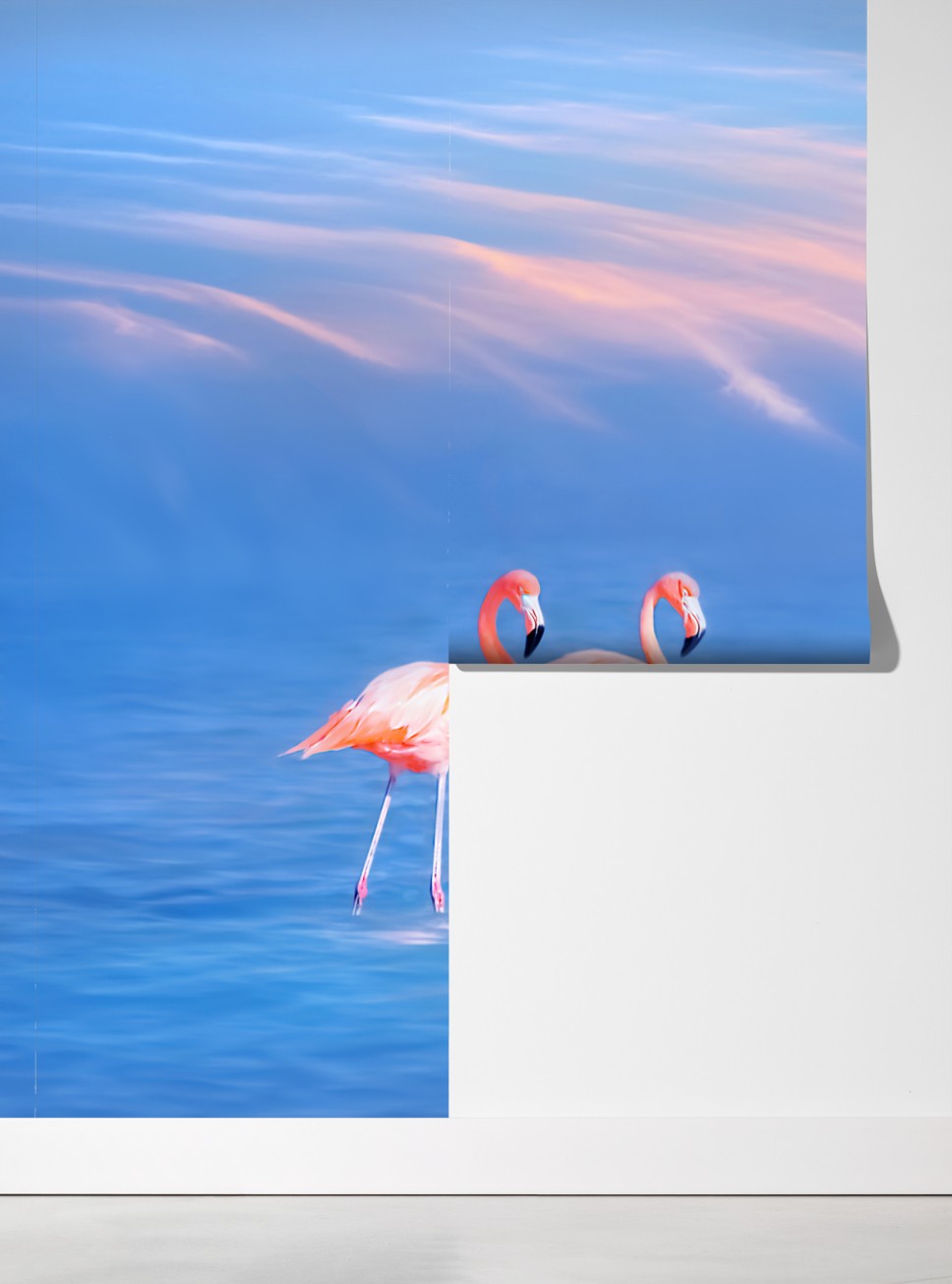 Fototapete rosa flamingos auf pastellfarbenem wasser – Wallnifity®
