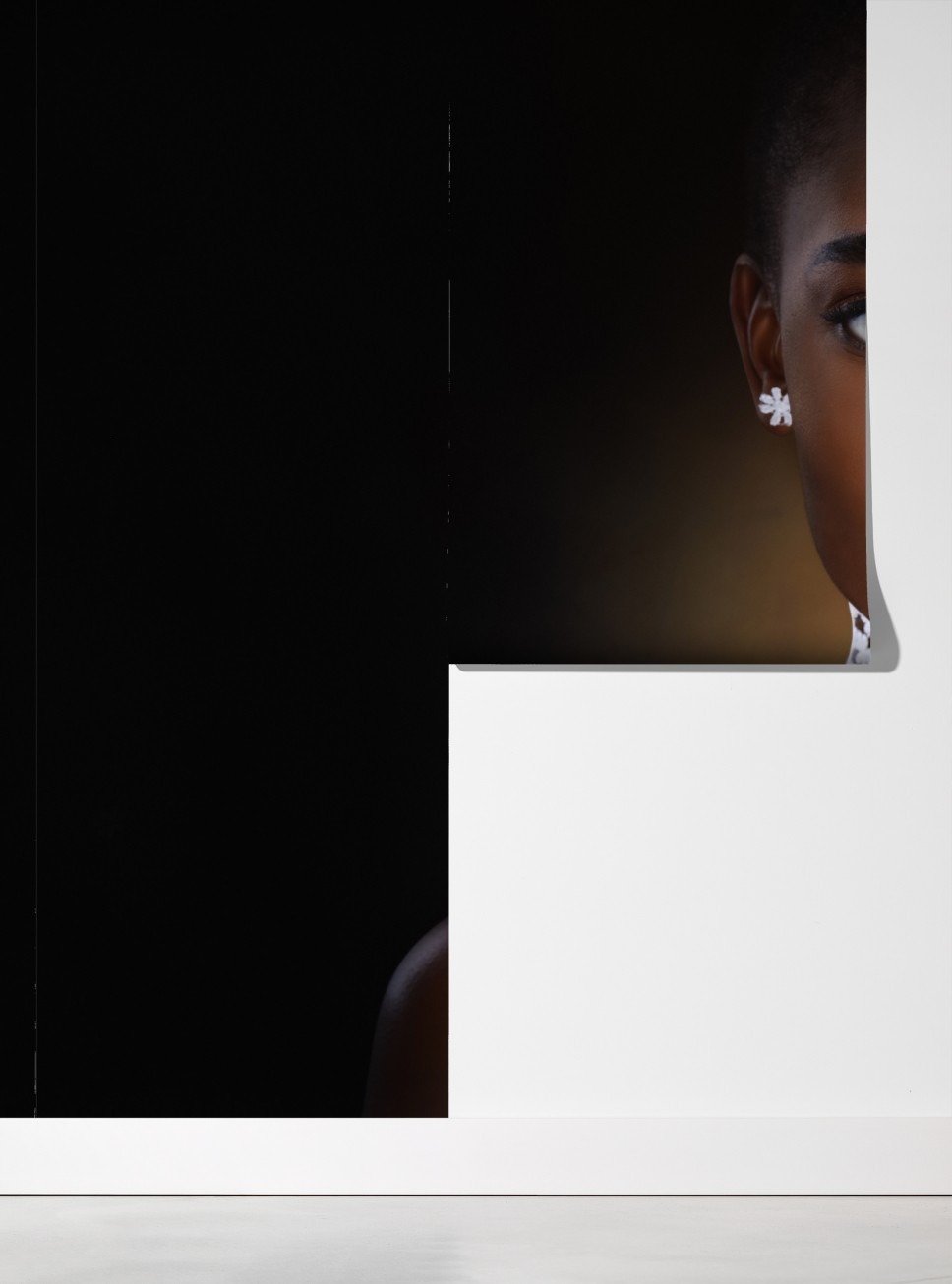 Verleihen Sie Ihrem Raum zeitlose Eleganz mit diesem eindrucksvollen Porträt einer Frau mit zarter Blumenhalskette, aufgenommen in satten Tönen und dramatischer Beleuchtung.